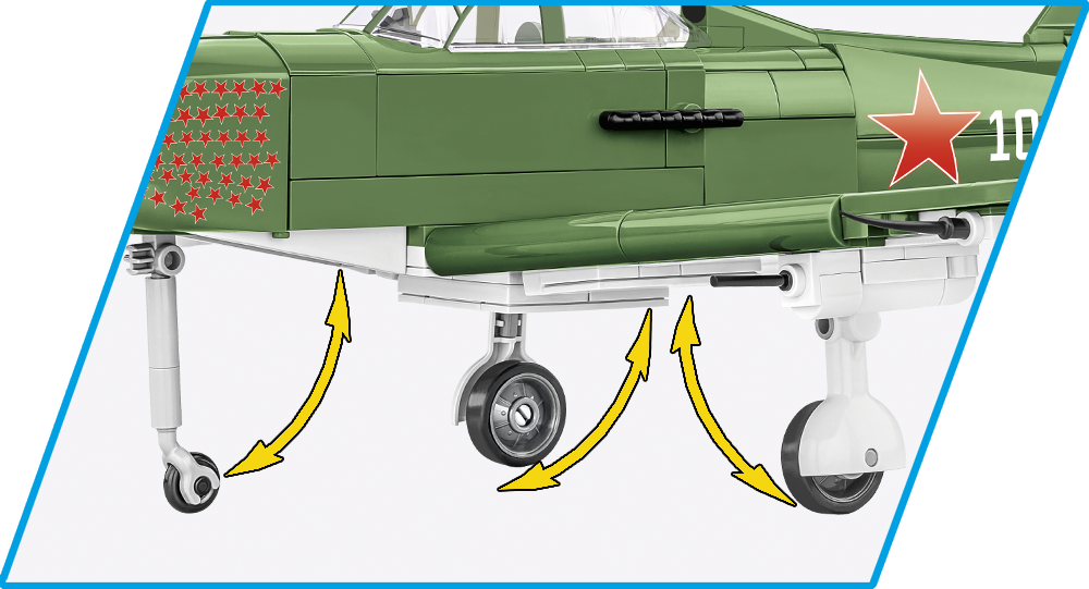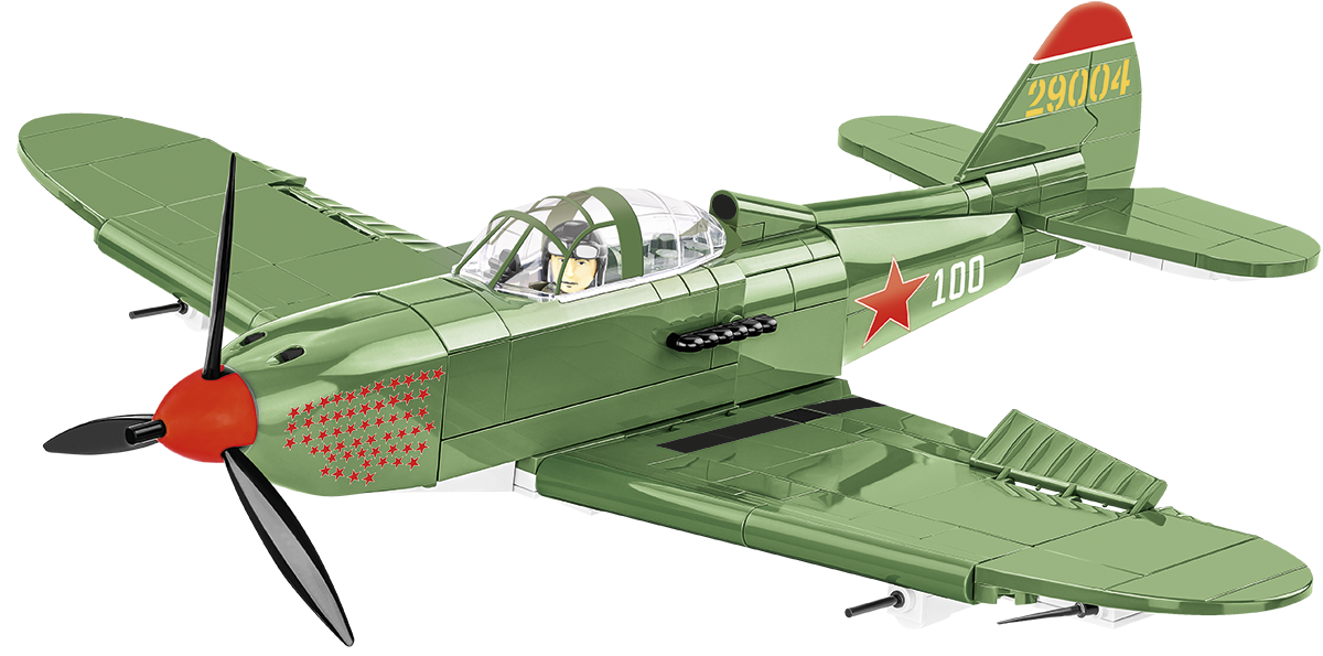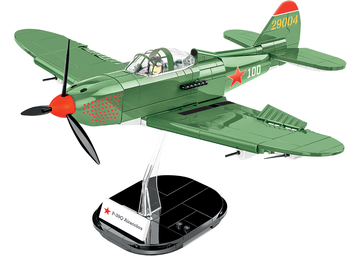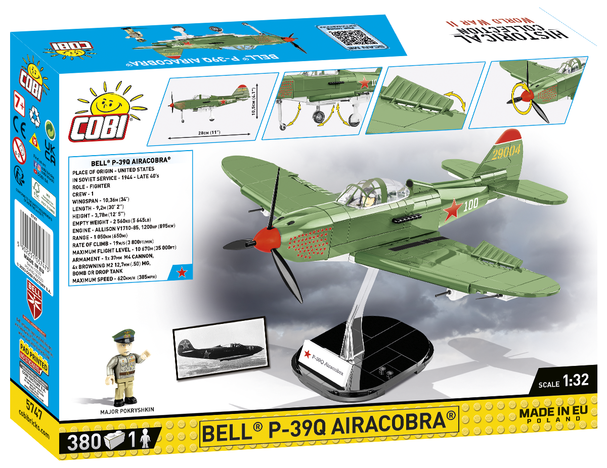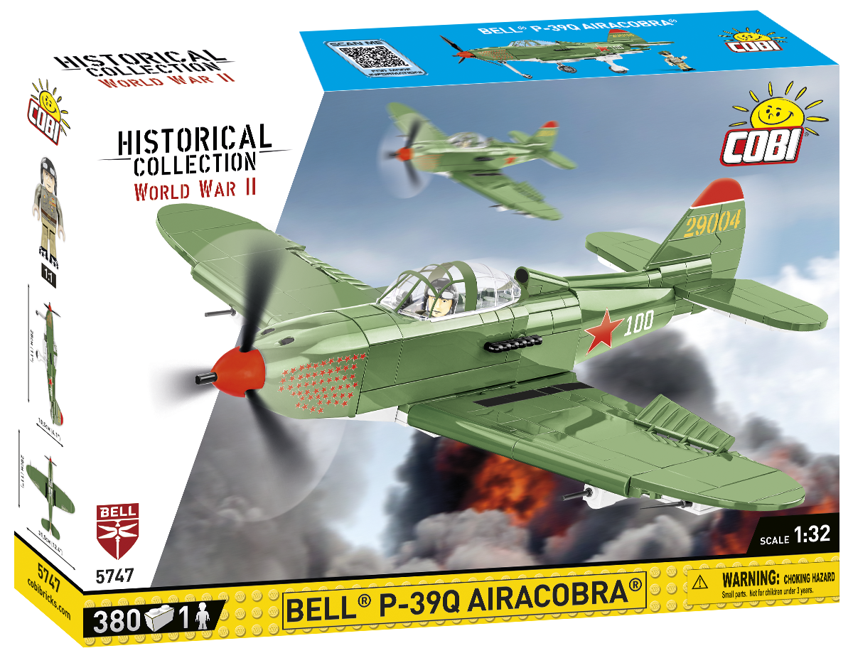 The BELL® P-39Q AIRACOBRA® was designed with 380 COBI construction blocks in 1:32 scale. The block model offers many movable elements such as a rotating propeller, movable wing ailerons and wheels with rubber tires that can be folded to a horizontal position. Details and historical American olive color markings have been recreated. The cockpit can also be opened to seat the historical pilot figure inside! Thanks to a special display stand with a plate containing the name of the plane and a place to attach the figure, the whole set looks great. The model uses durable prints and historical markings. The set completes the collection of WWII planes issued in 1:32 scale, intended for enthusiasts of history, military technology and fans of the highest quality block modeling!