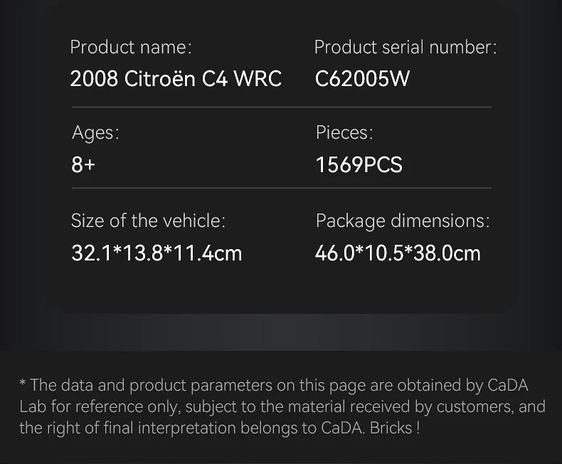 CaDA 2008 Citroen C4 WRC is an officially authorized product. This 1:12 model is a dedicated model for WRC events and is the Citroen brand WRC2008 championship vehicle.
