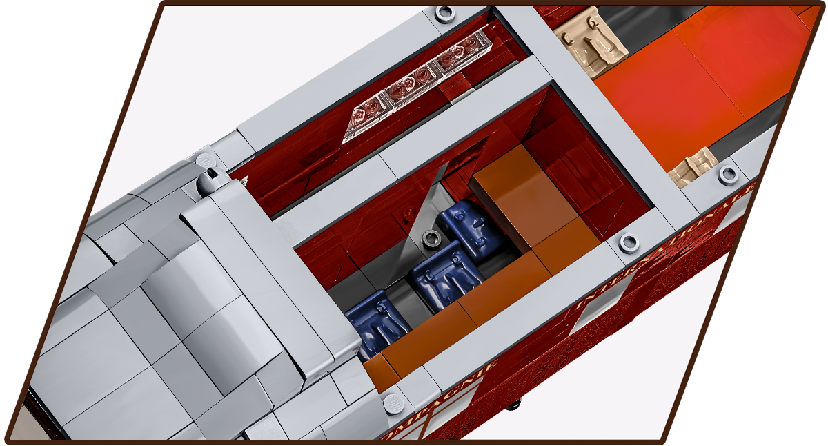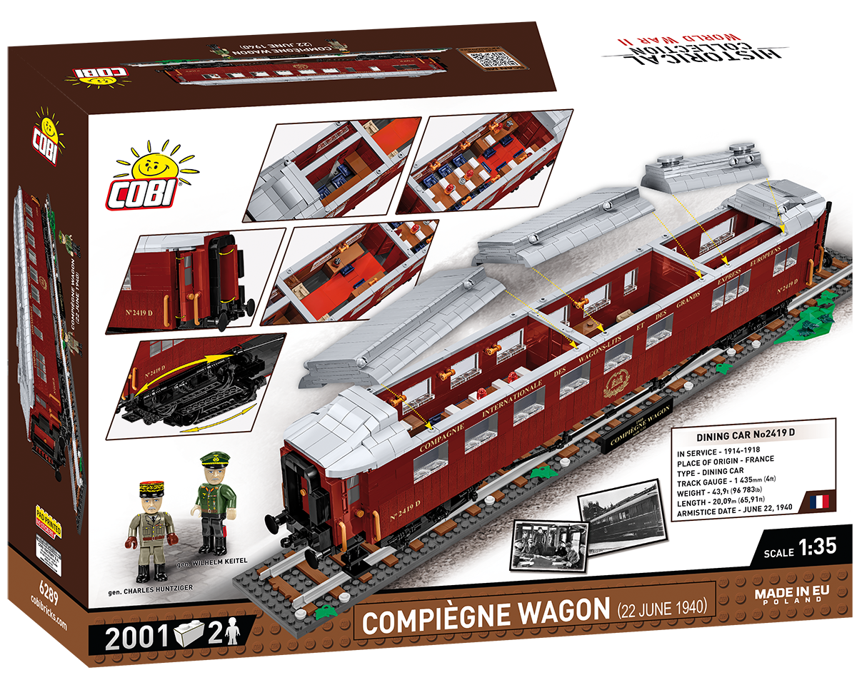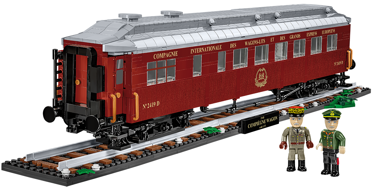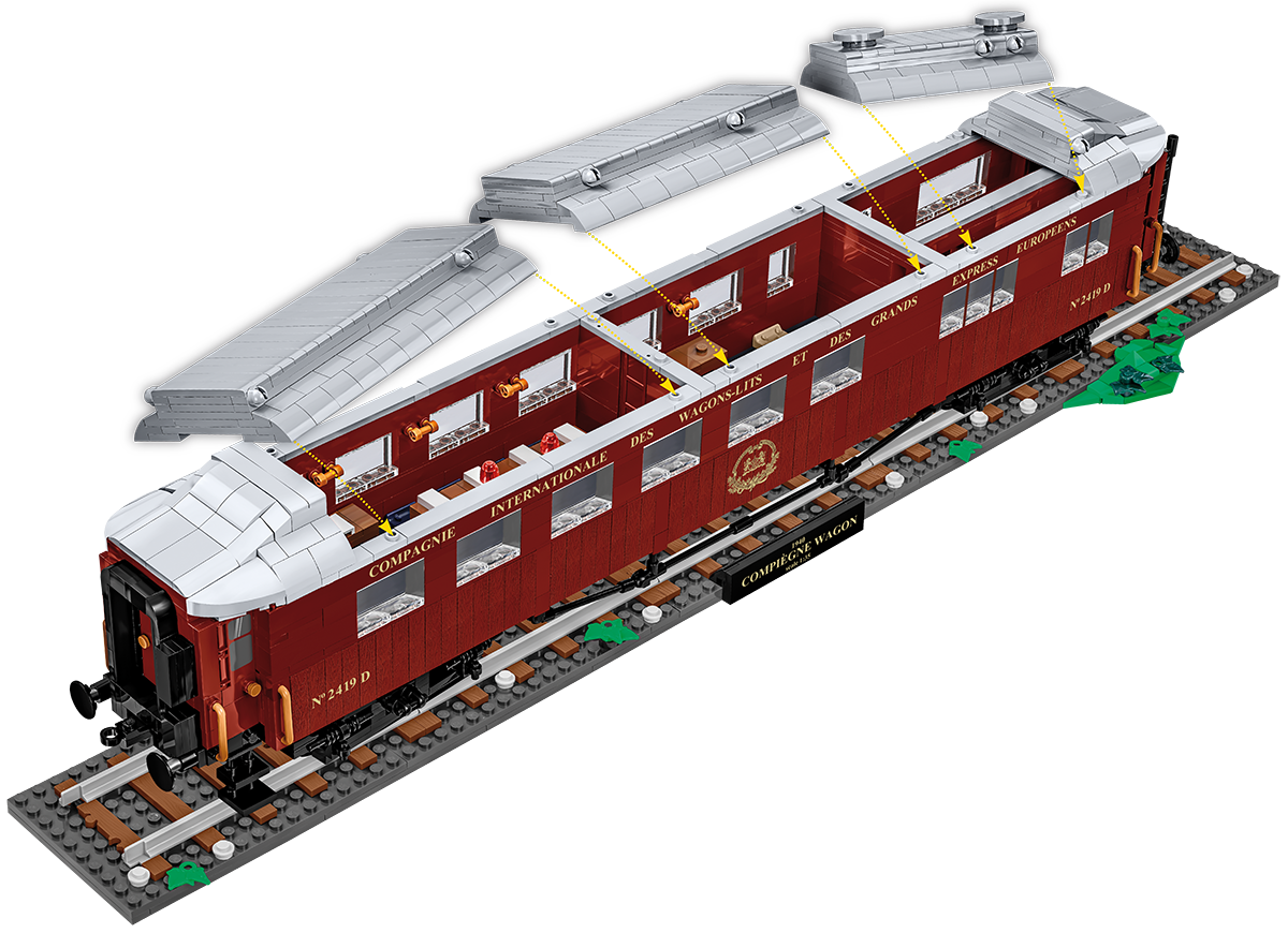 The wagon, measuring almost 60 centimeters, is a completely new entry to the railway series from COBI. Behind its detailed sides there is a perfectly reproduced interior, which can be easily seen after easily detaching the roof. The aforementioned sides are covered with blocks with wood texture and prints, thanks to which the wagon looks just like the original. The gold prints show the logo of Compagnie Internationale des Wagons-Lits, the wagon number and an extensive slogan located above the windows. The wagon has opening doors on the sides, on its front walls in the passages between the wagons and inside between the subsequent sections. The wagon's interior is the same as in June 1940. The set includes two figures representing the two sides that signed the armistice.