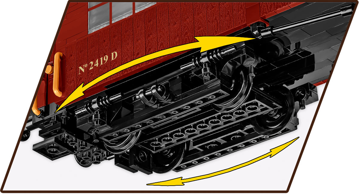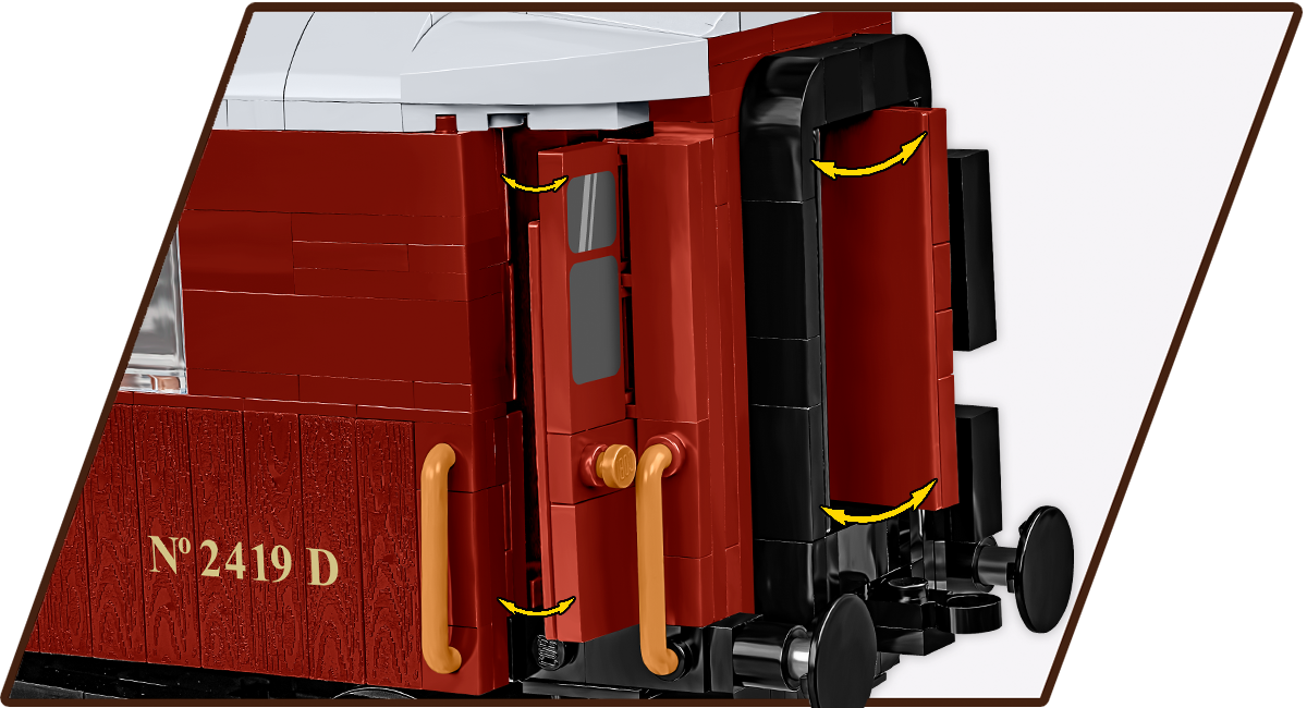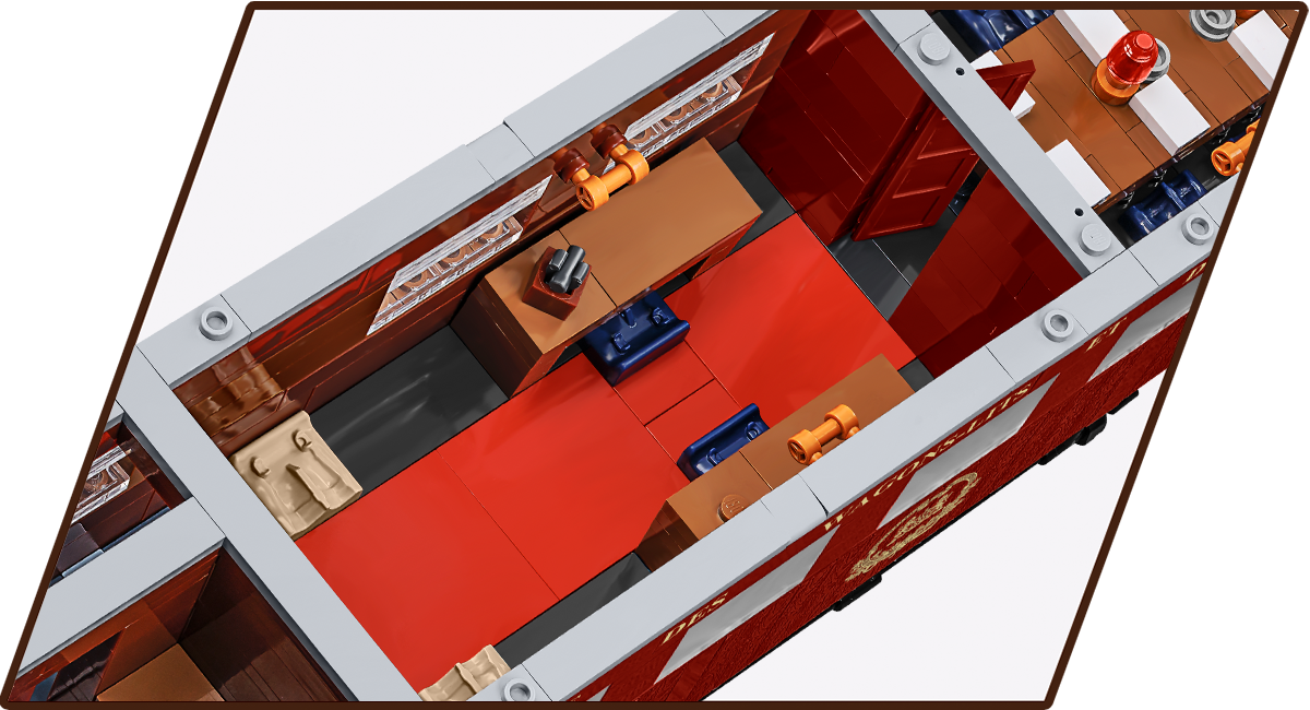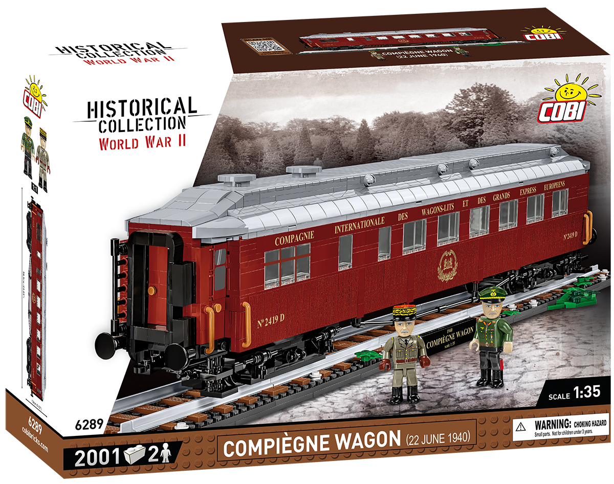 The wagon, measuring almost 60 centimeters, is a completely new entry to the railway series from COBI. Behind its detailed sides there is a perfectly reproduced interior, which can be easily seen after easily detaching the roof. The aforementioned sides are covered with blocks with wood texture and prints, thanks to which the wagon looks just like the original. The gold prints show the logo of Compagnie Internationale des Wagons-Lits, the wagon number and an extensive slogan located above the windows. The wagon has opening doors on the sides, on its front walls in the passages between the wagons and inside between the subsequent sections. The wagon's interior is the same as in June 1940. The set includes two figures representing the two sides that signed the armistice.