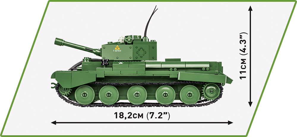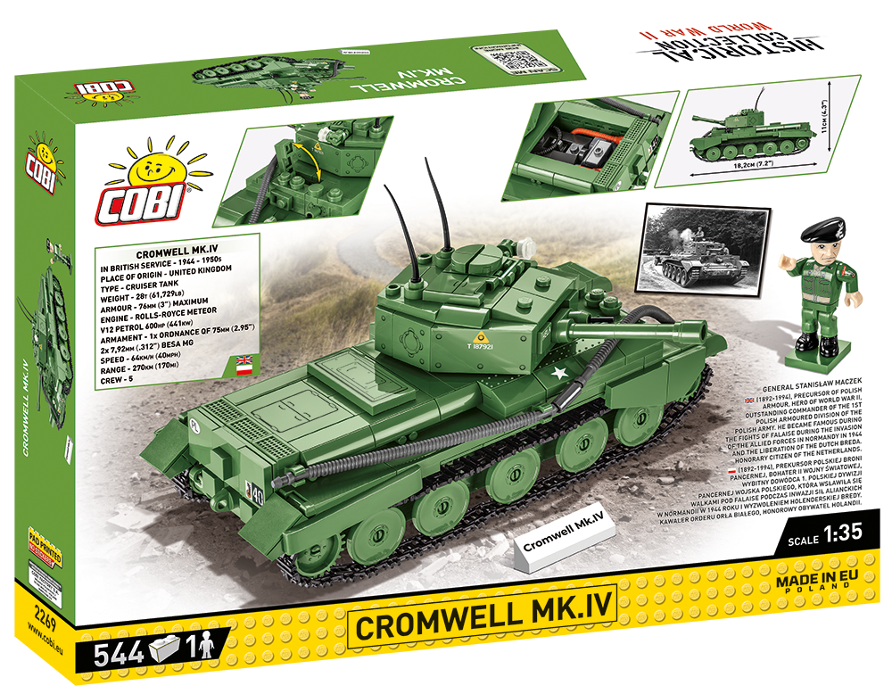 The WWII Cromwell Mk. IV tank "HELA" featuring the exact markings of the famous command tank of general Stanisław Maczek from the 1st Armored Division (Black Devils) of the Polish Armed Forces fighting alongside the Allies. Carefully reproduced from 544 bricks, the set was developed in a 1:35 scale matching our figures. All elements of historical markings and details are high-quality prints! There are no stickers in the set. The tank's functionalities include: an opening hatch, access to the engine, a movable turret, a rotating cannon and working tracks. There is also a plate with the name of the famous tank.