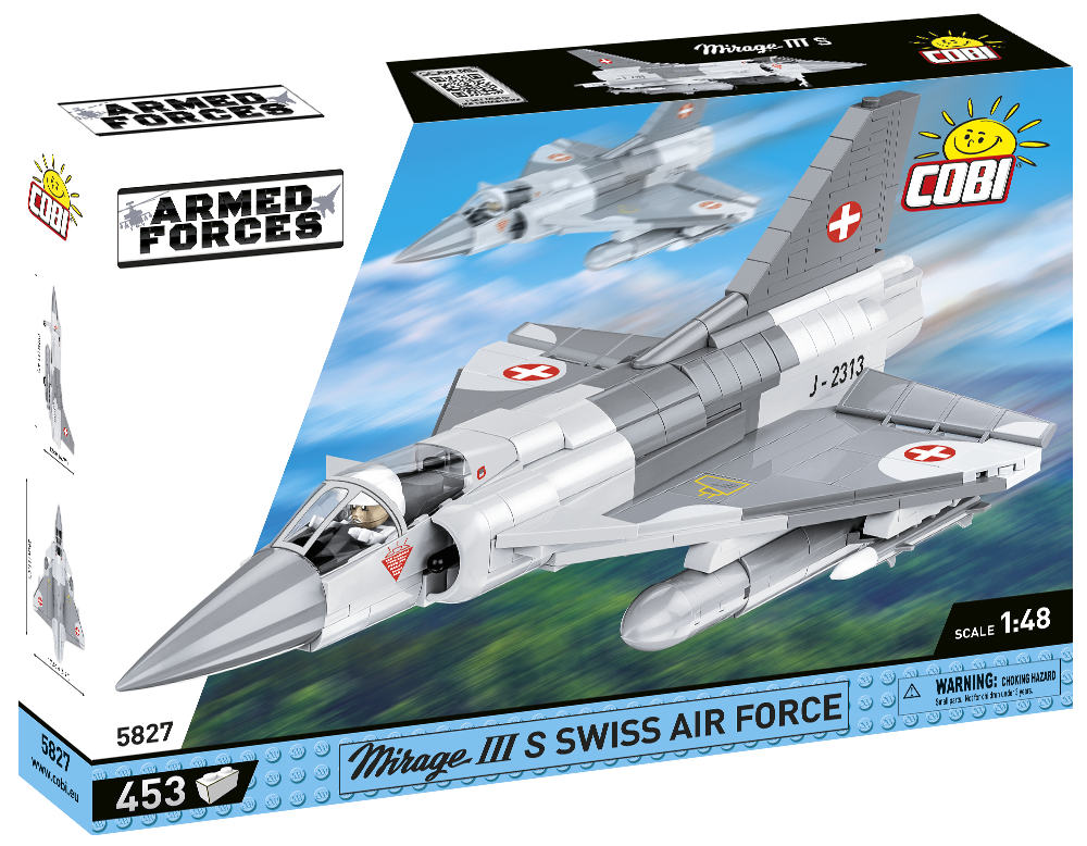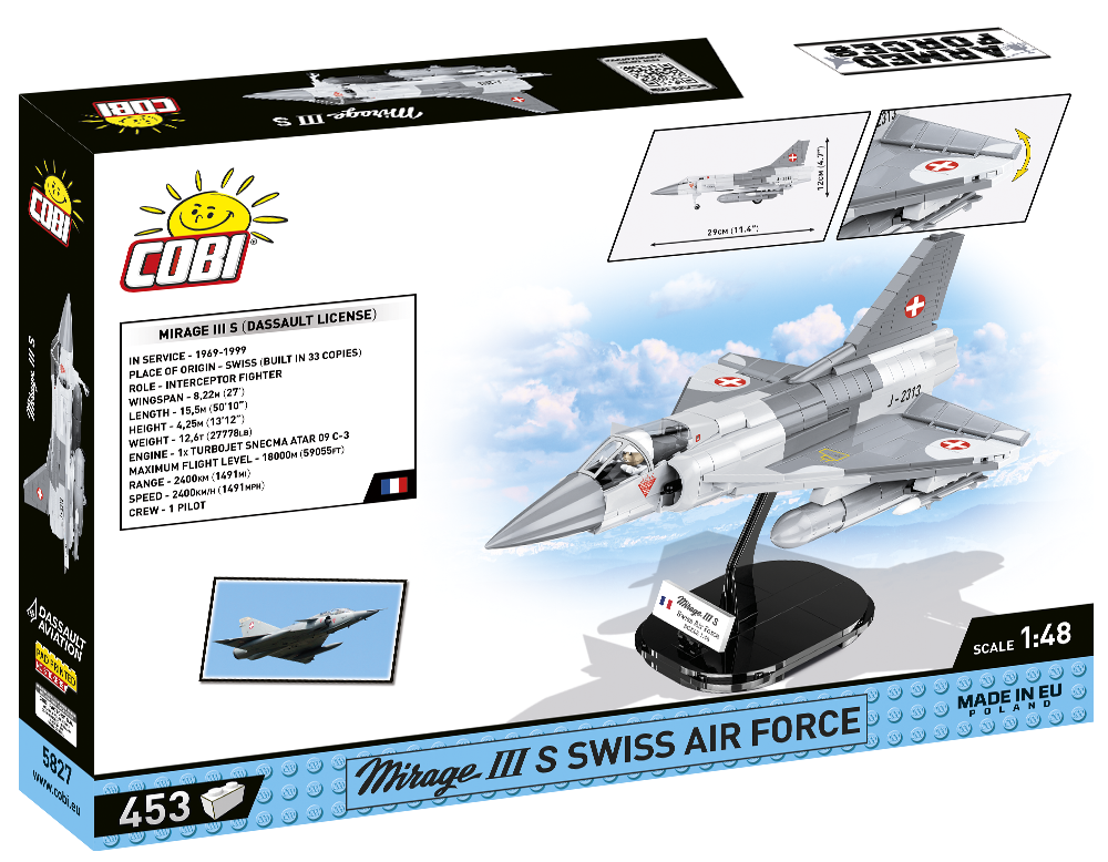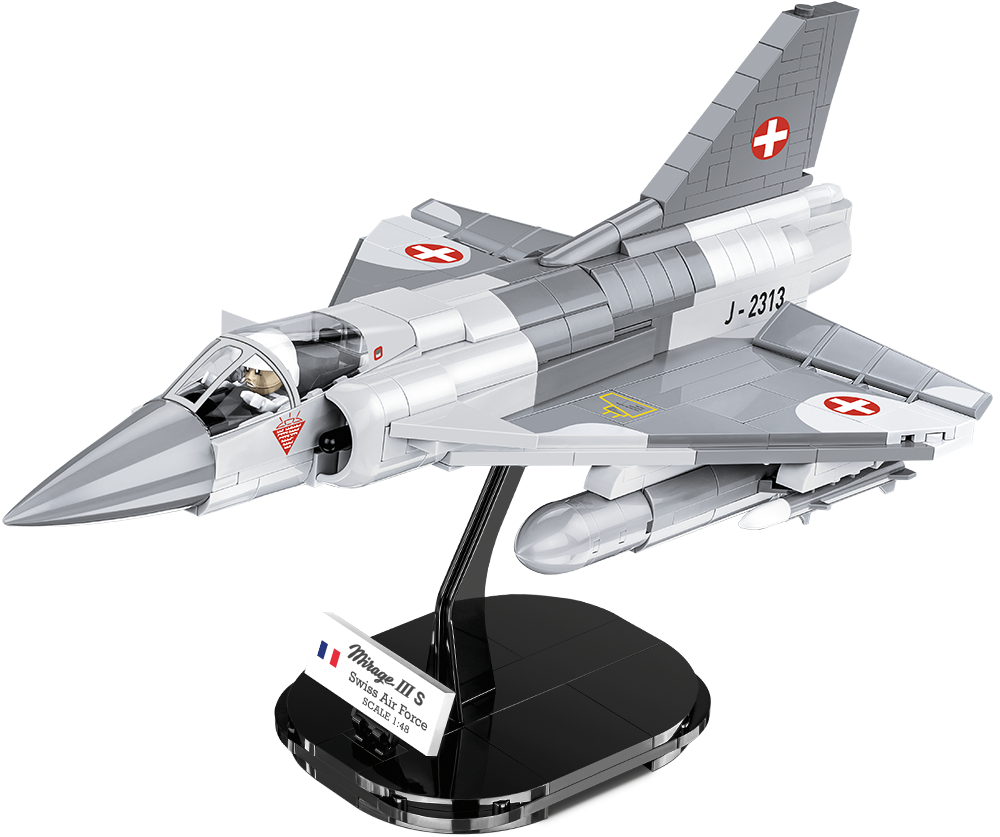 We at COBI released the Mirage IIIS model in 1:48 scale under the original license from Dassault Aviation. It was developed entirely from 453 COBI building blocks and is intended for both play and display. The design of the aircraft has been improved in relation to the previously released Mirage 2000. Due to the detailed reproduction of even the smallest details, it will be a great decoration for any collection of military enthusiasts and modern military aviation. Only high-quality, durable prints were used in the model. The plane has many movable elements such as wheels that can be folded up, ailerons, an opening pilot's cockpit and finally weapons. The set includes a special pilot body that can be placed in the cockpit. The set also includes a special display stand and a plate with the name of the set.
