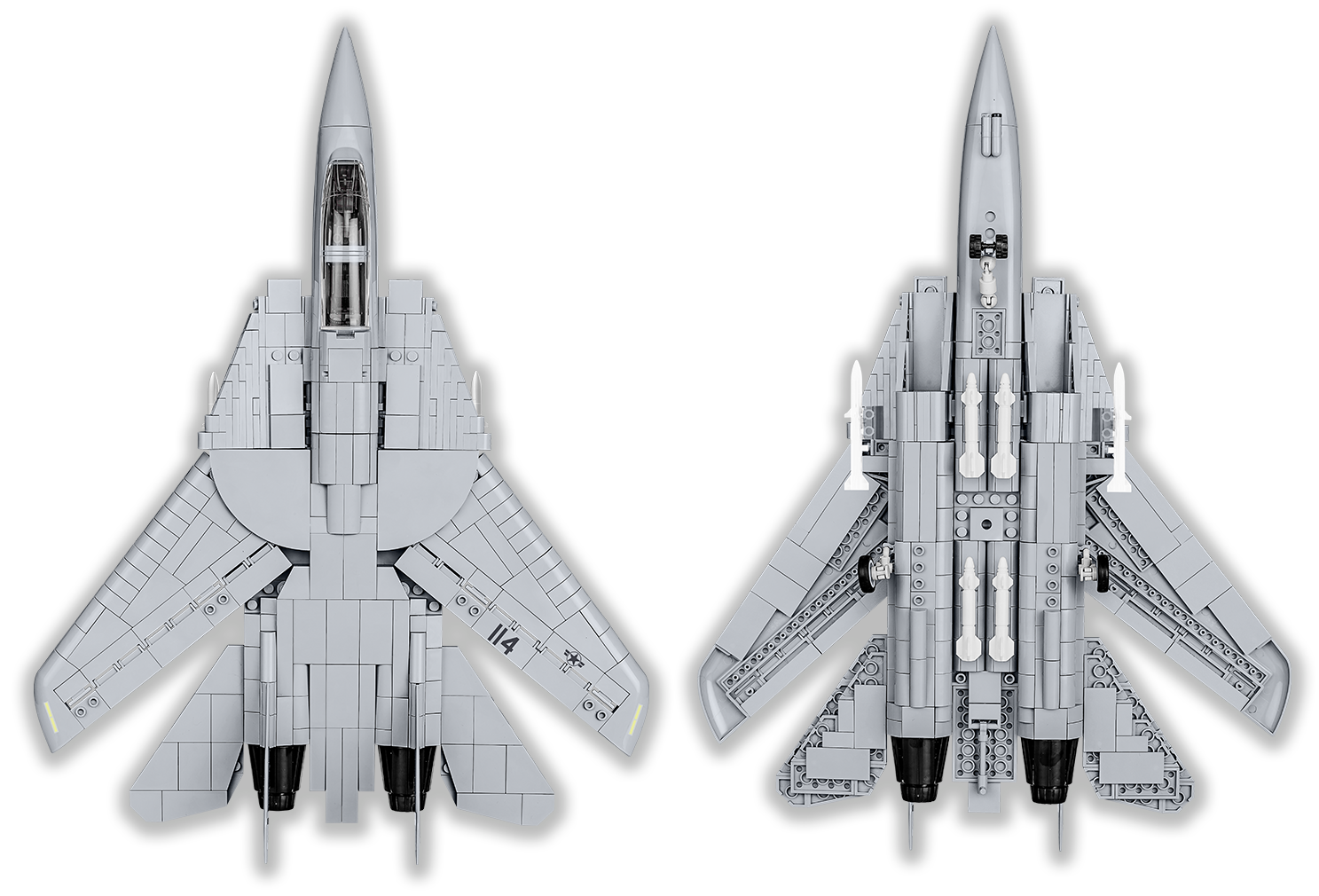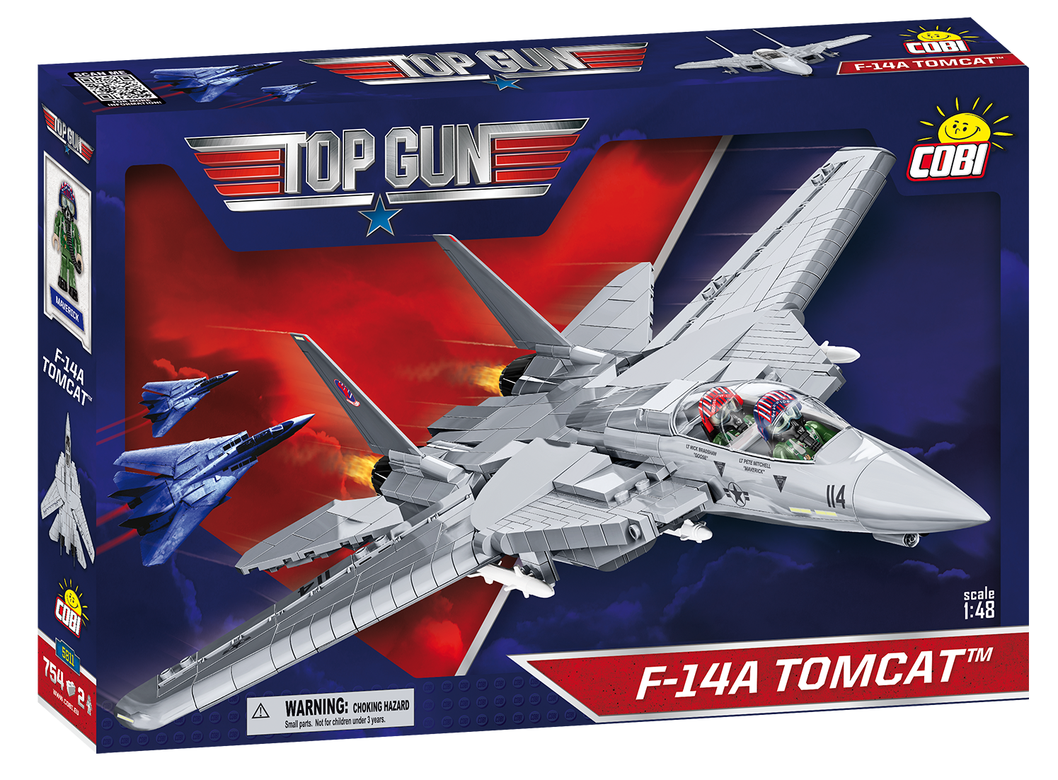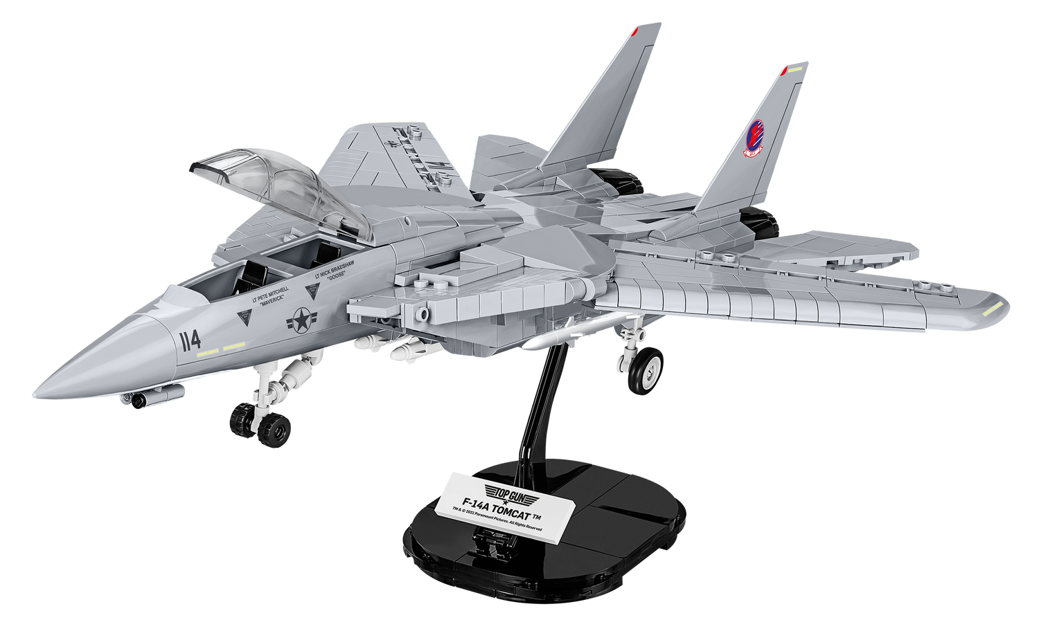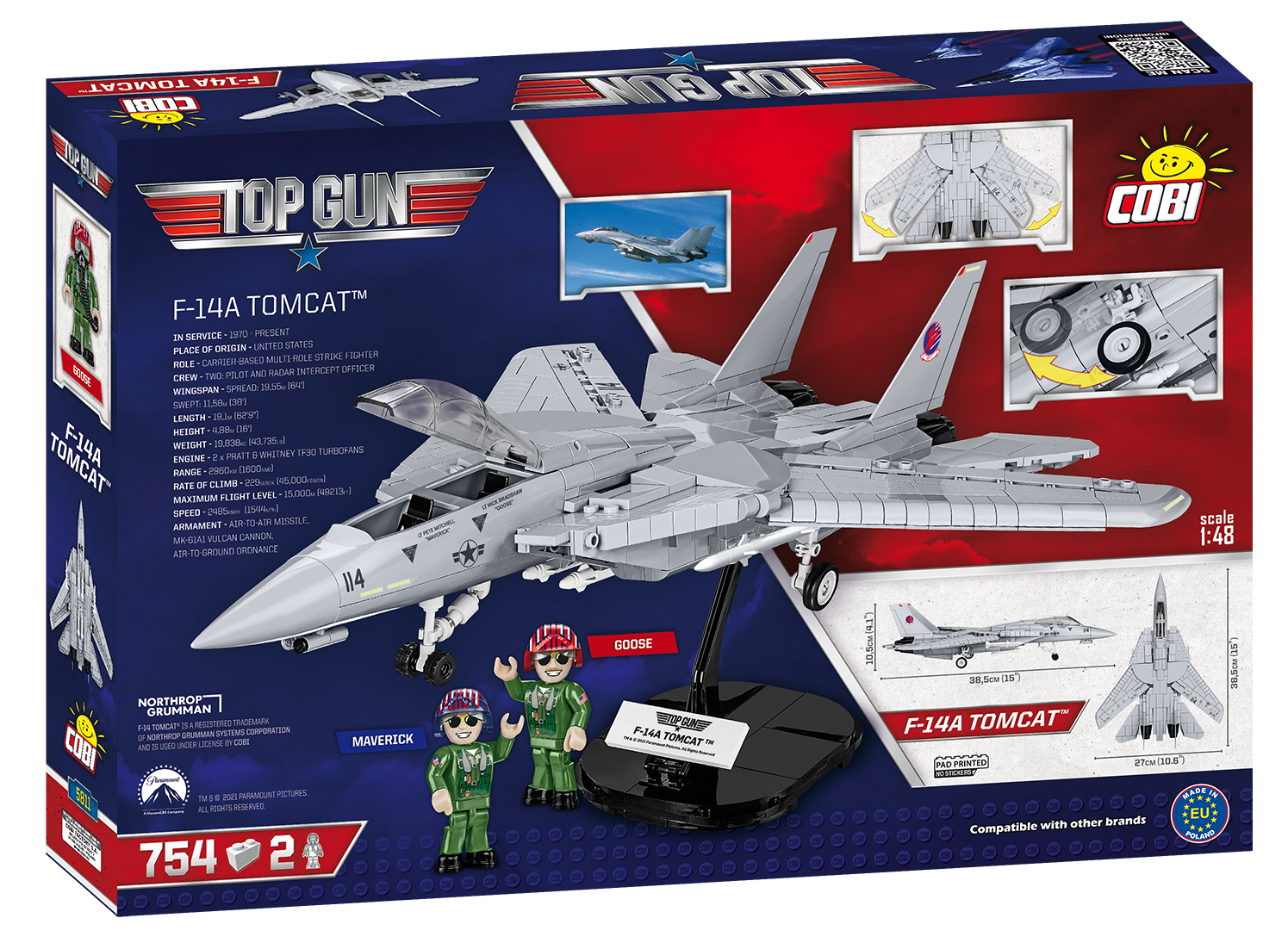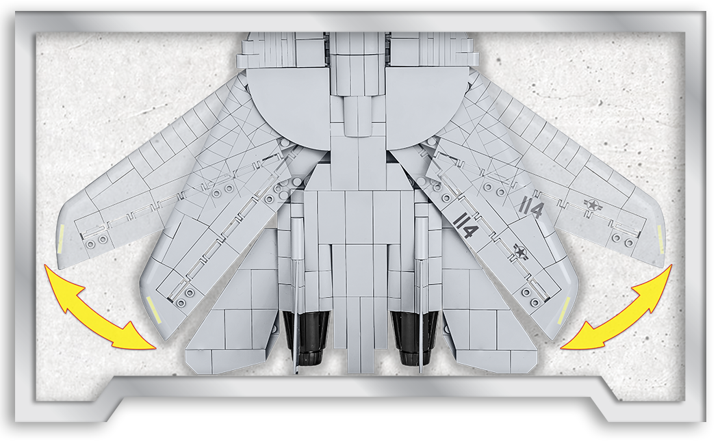 The COBI F-14 TOMCAT is a unique aircraft model released under the original TOP GUN™ and NORTHROP GRUMMAN license. Legendary U.S. Navy film pilot Pete "Maverick" Mitchell and his partner "Goose" fly just such a two-seater aircraft. Returning to this iconic film production, you can now build your own F-14 in 1:48 scale! The model has been faithfully reproduced from 754 COBI building blocks. In the set you will find high-quality prints faithfully replicating the original painting of the film jet. The model is equipped with variable geometry movable wings and rotating wheels. Under the wings there is a large arsenal of weapons. There are two figures in the cockpit. The figures mimic the appearance of the characters of the film and are equipped with distinctive helmets and oxygen masks. The F-14 set also includes an elegant block display stand and a plaque containing the name of the aircraft and the movie logo. This exclusive licensed set will certainly be a unique gift for anyone who loves aircraft, regardless of the age of the aircraft enthusiast. The F-14 will also look perfect in an elegant office or in a teenager's room.