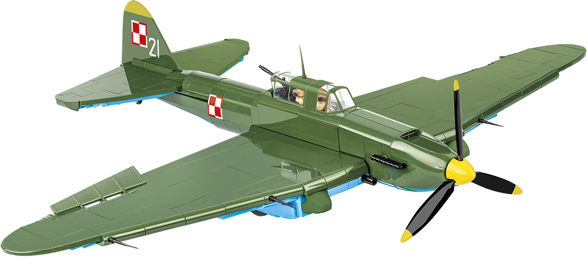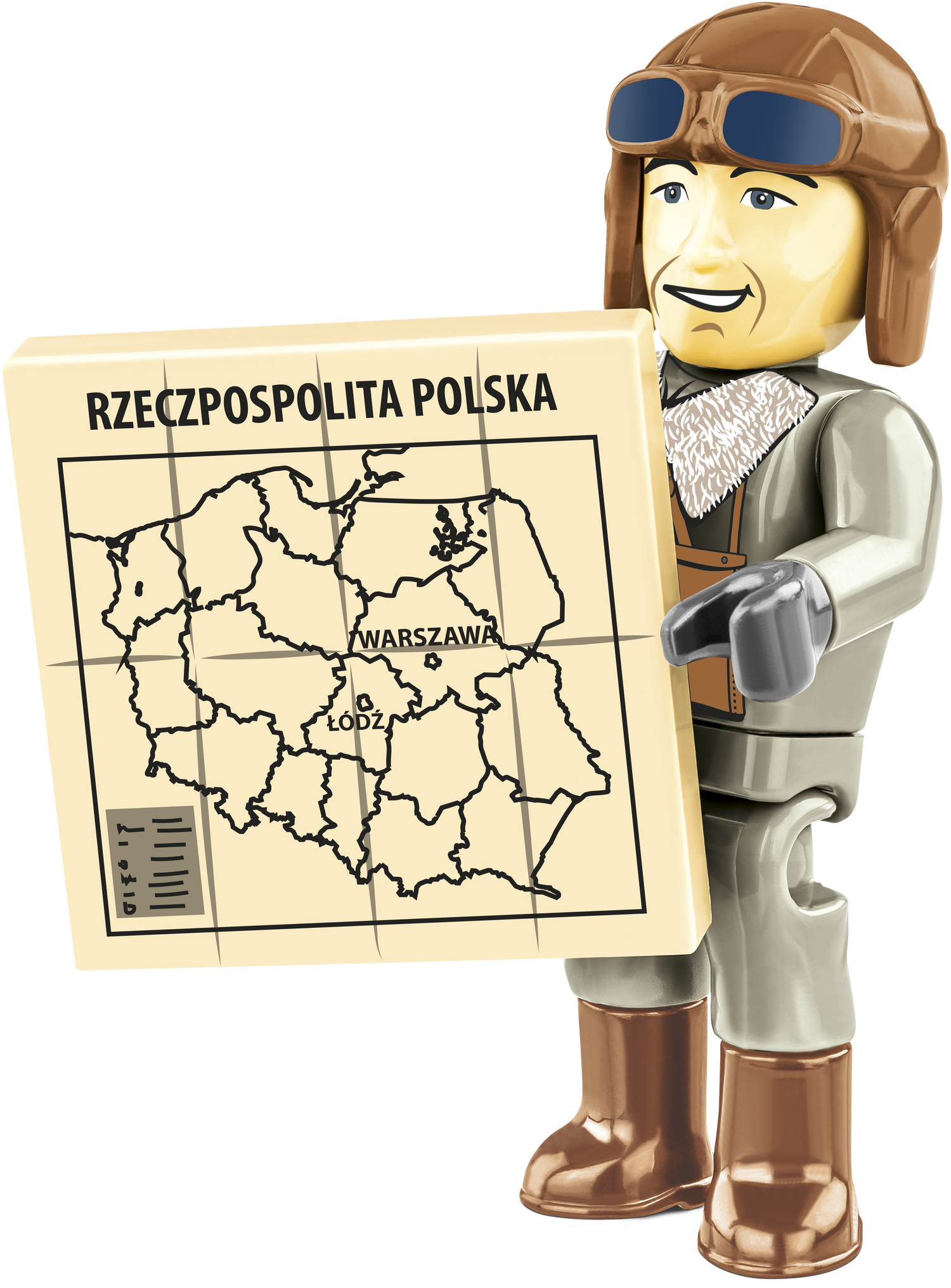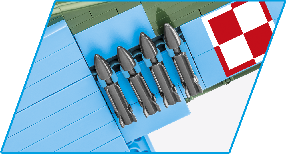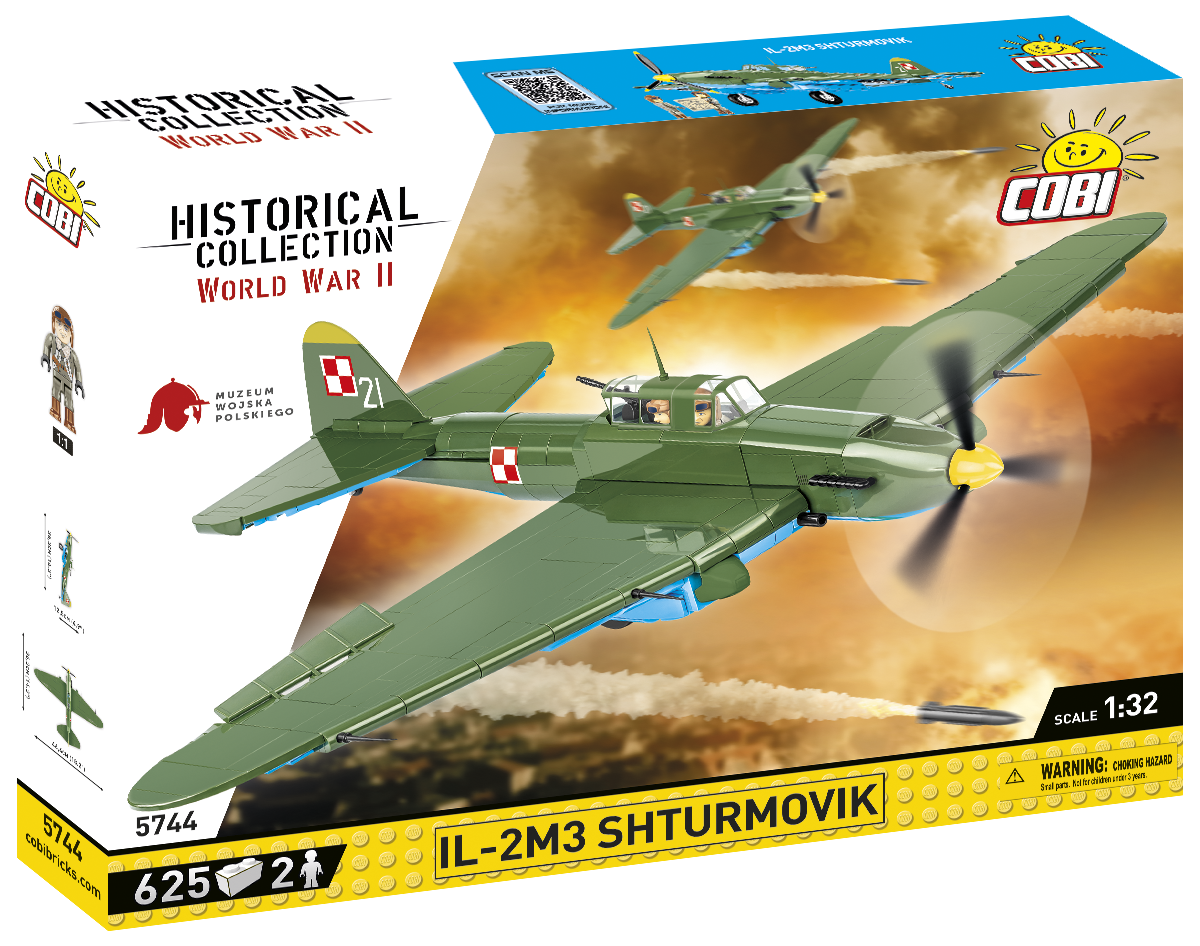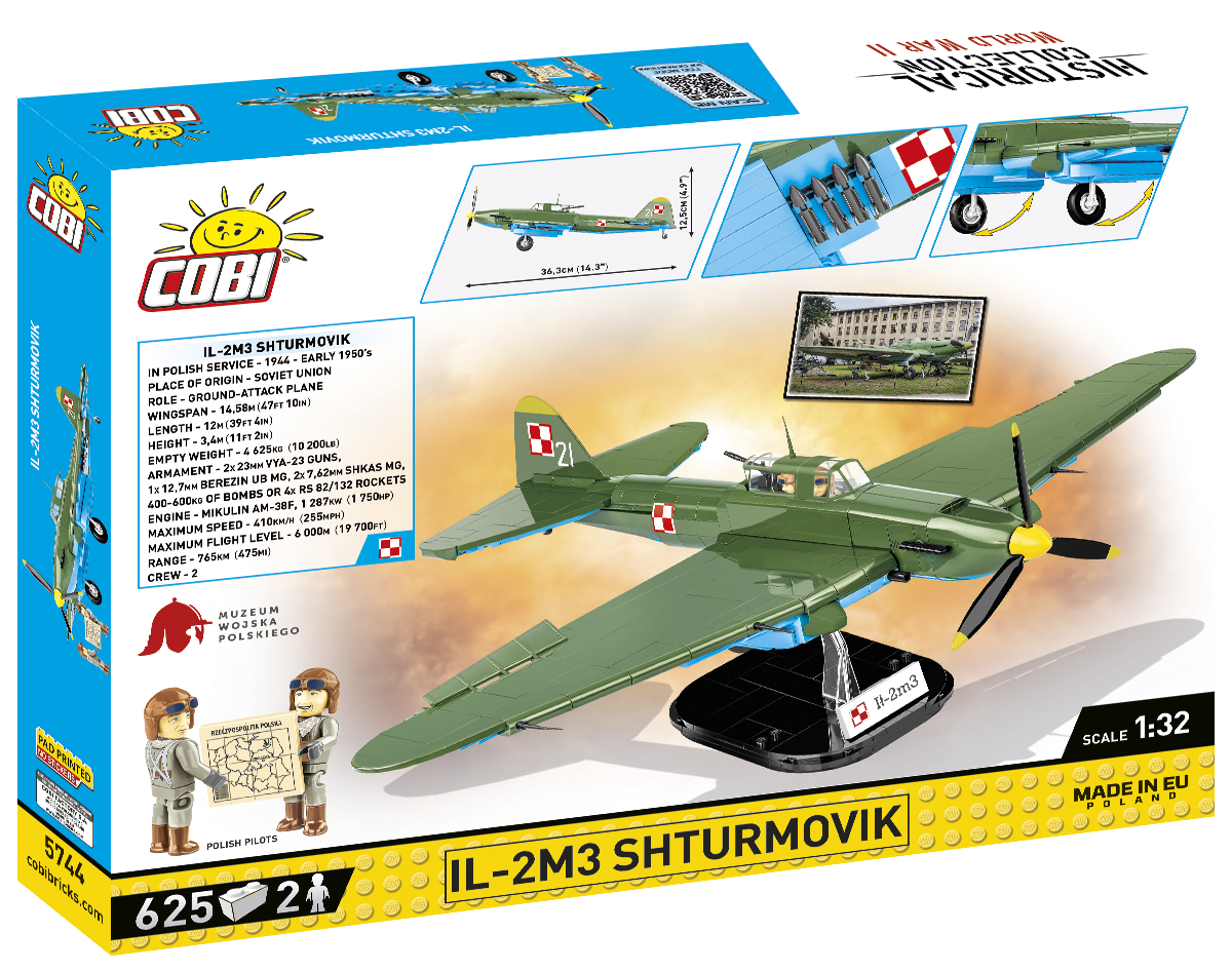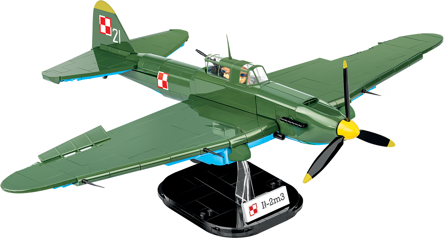 The IL-M3 aircraft was designed from COBI construction blocks in the scale of 1:32 using all-new elements. One of the few original planes is on outdoor exhibition at the Polish Army Museum in Warsaw. It was used as a model for this set. The block model offers many movable elements such as a rotating propeller, movable wing ailerons and wheels with rubber tires that can be folded to a horizontal position. Details and post-war colors of the aircraft and armament (including rockets) have been reproduced. Attention is drawn to the blue bottom with chessboard markings. The cockpit canopy has been redesigned and can be opened to seat the pilot and gunner figures in the seats. Thanks to a special display stand with a plate containing the name of the plane and a place to attach the figures, the whole set looks fantastic! The figures were developed based on uniforms in the collection of the Polish Army Museum.
