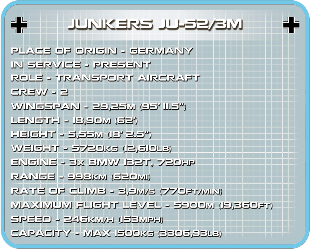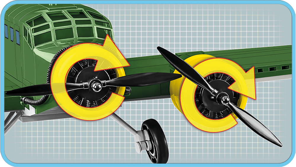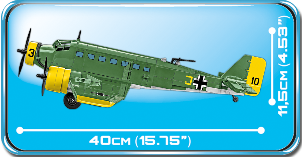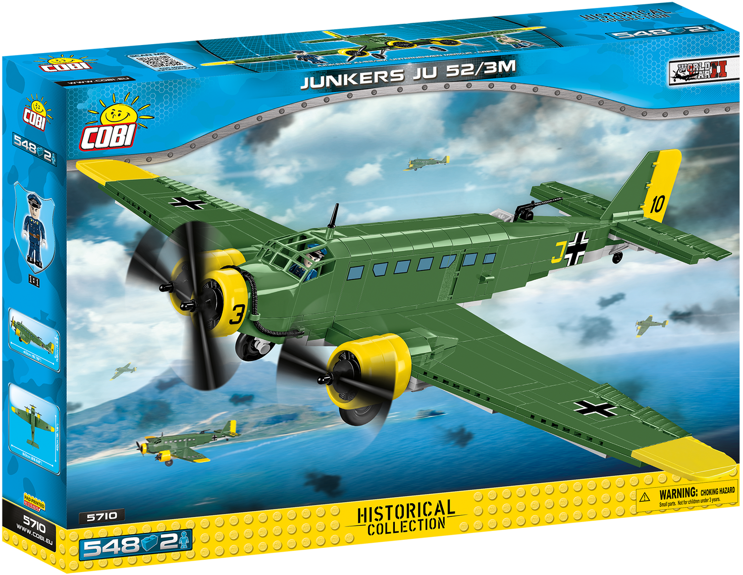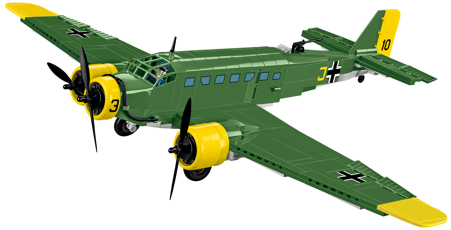 From the world of COBI comes a model of the Junkers Ju 52/3m. The model has many movable elements such as rotating wheels with rubber tires, movable propellers, ailerons and opening doors. A pilot figure comes with the kit. Thanks to the faithfully reproduced proportions and details of the aircraft, the model will be addition for any collection of history and aviation or It would make great toy for even the youngest aviation enthusiast.