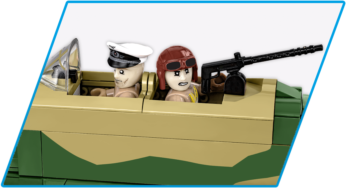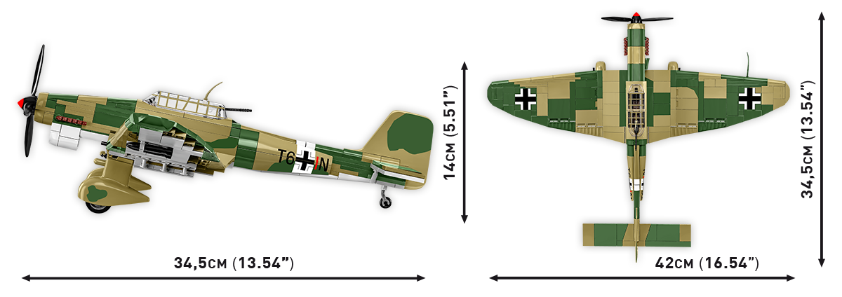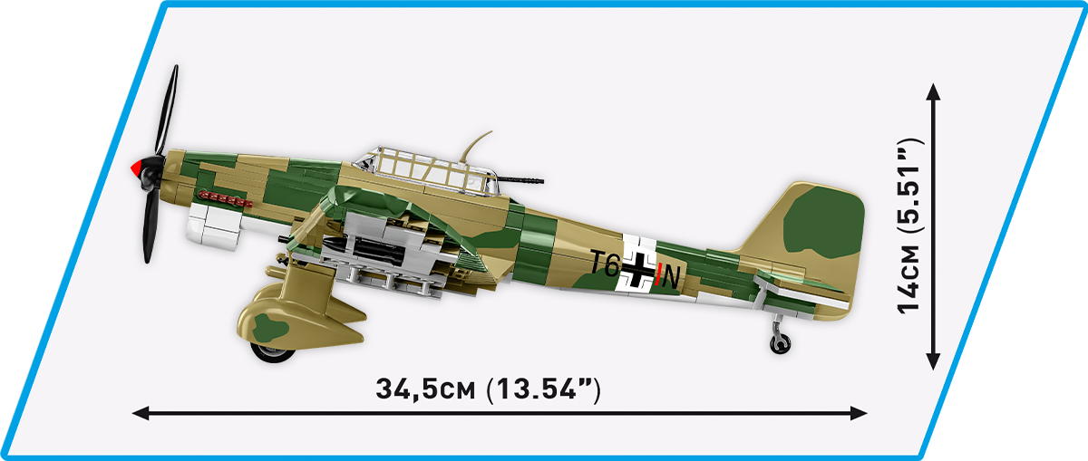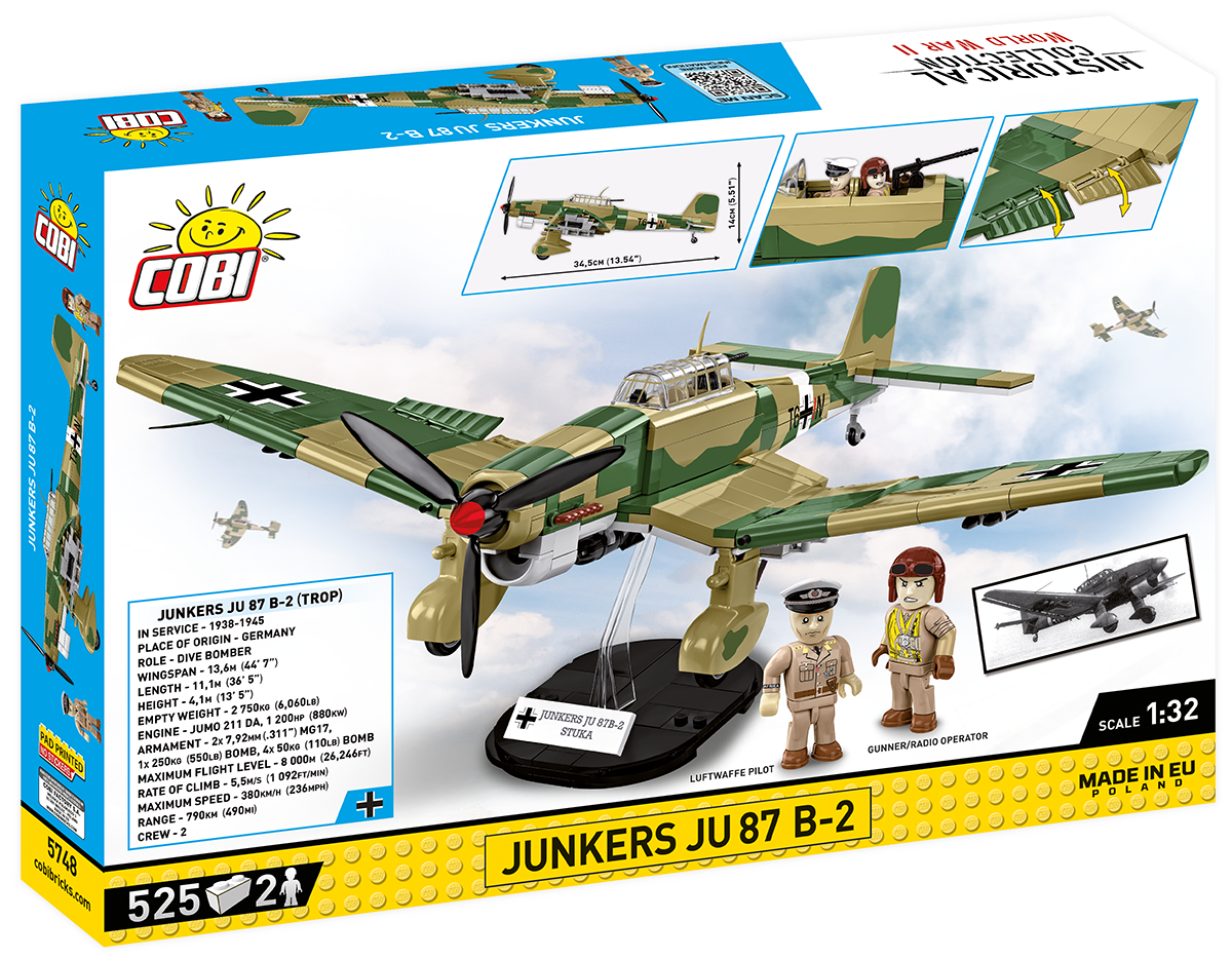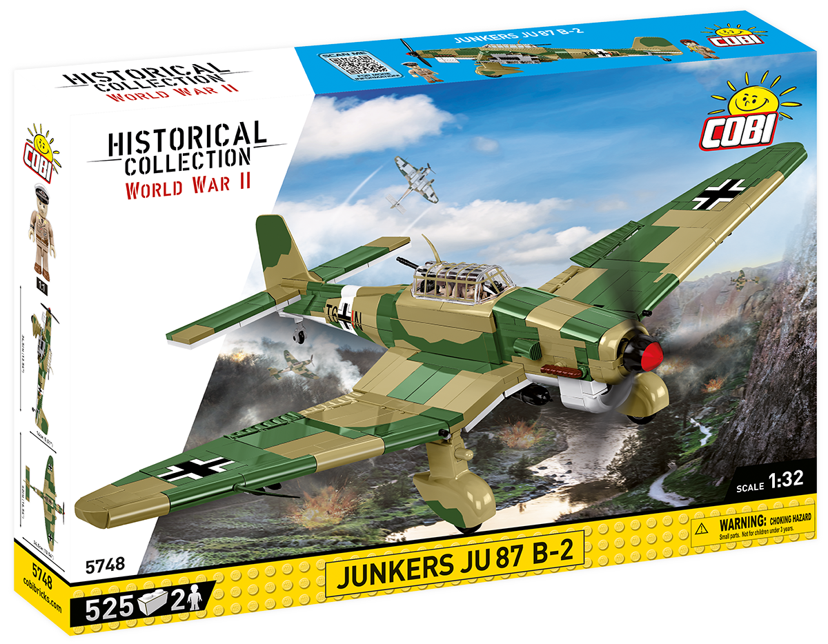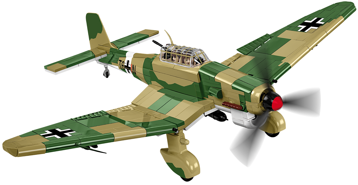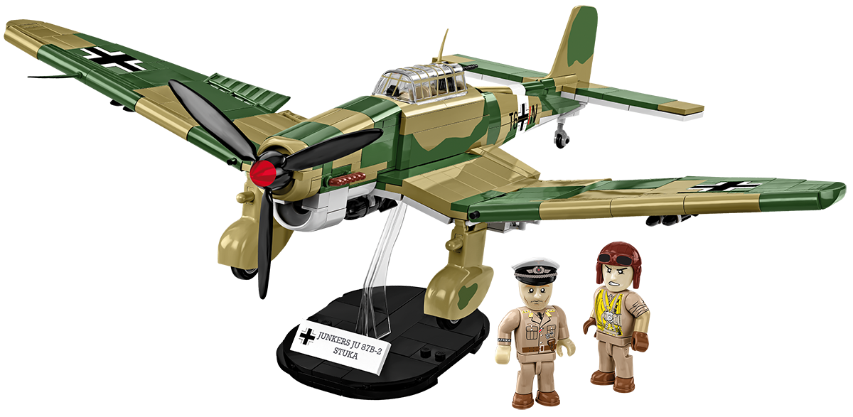 The plane has a moving propeller and ailerons and rotating wheels with rubber tires. The cockpit can be opened to seat the carefully designed pilot and gunner/radio operator figures at the controls. When built the plane is 34.5cm long. The set also includes a special stand with a transparent pin, with which you can display the plane "in flight". The set is also complemented by a plate with the name of the plane. The JU 87 B-2 in tropical camouflage is a perfect addition to the WWII aircraft collection! The set will delight not only young history enthusiasts, but even adult collectors and fans of military technology. Build history, piece by piece, with COBI!
