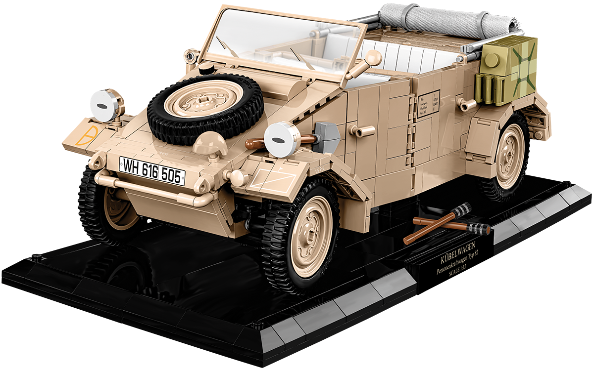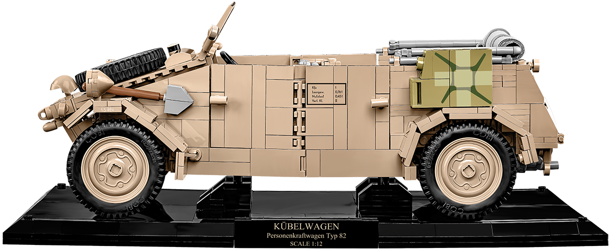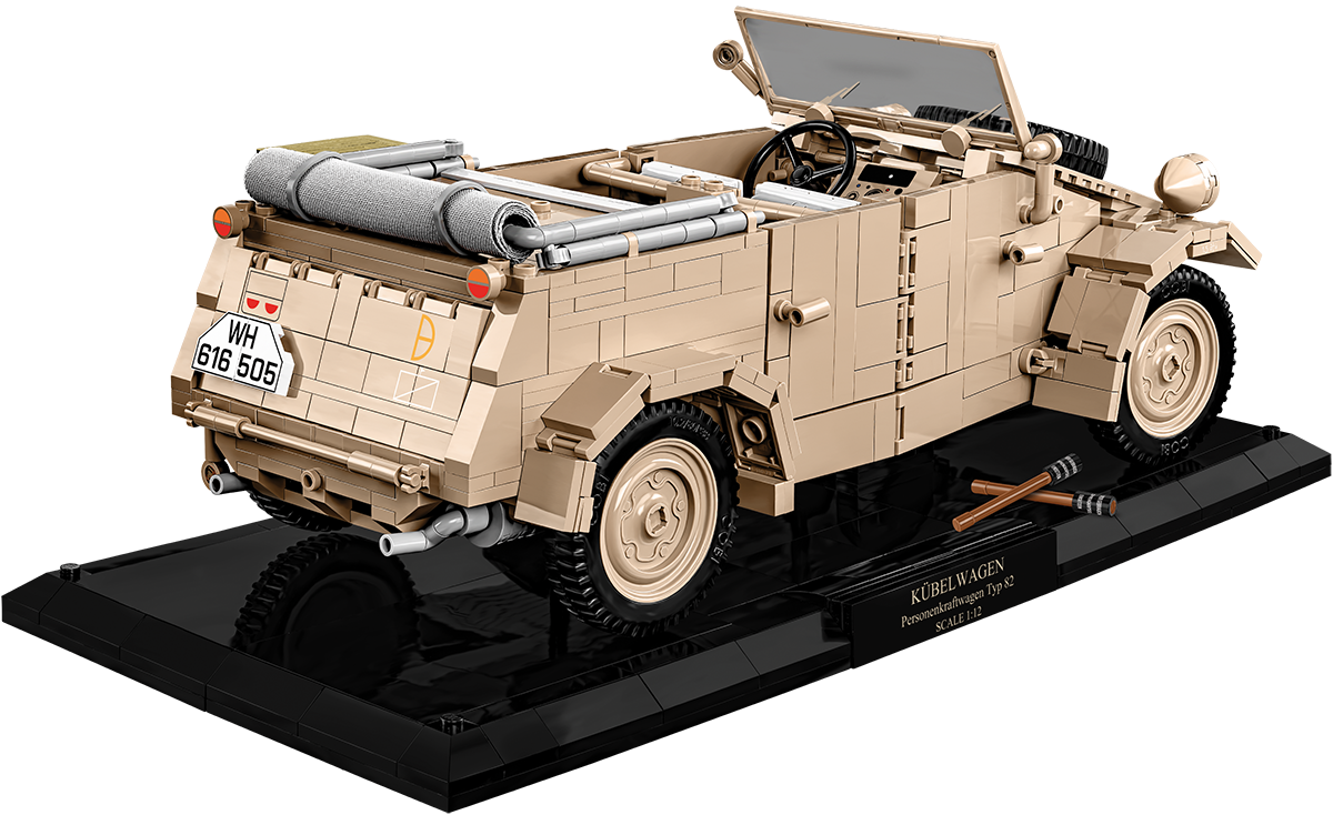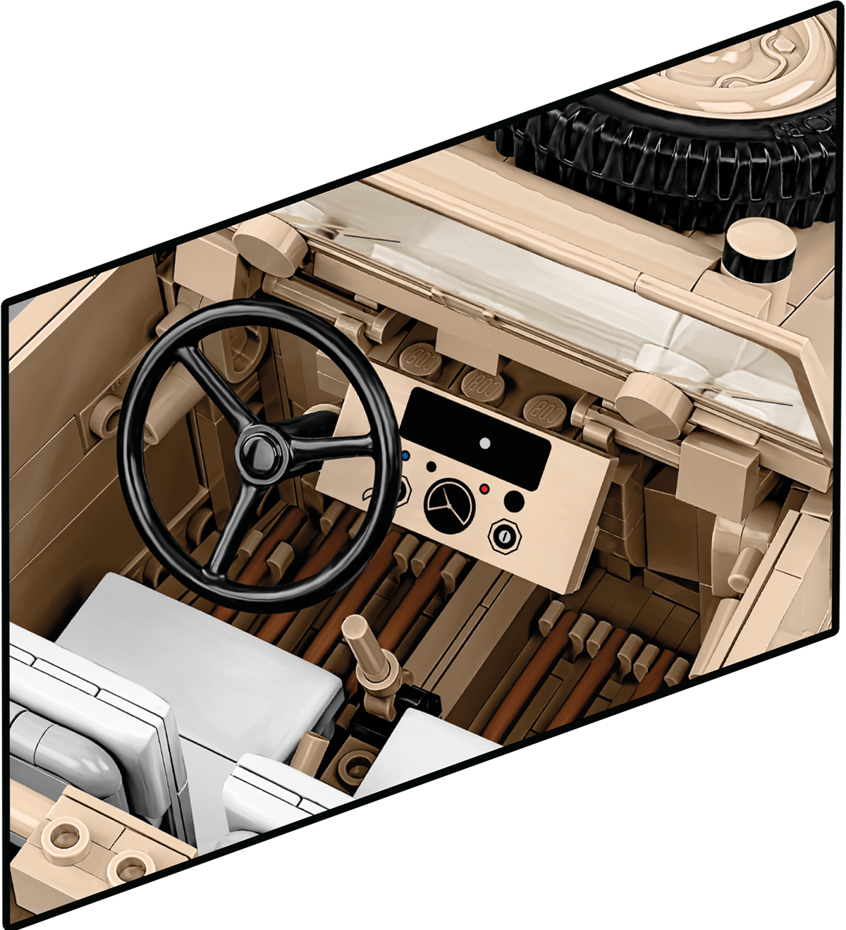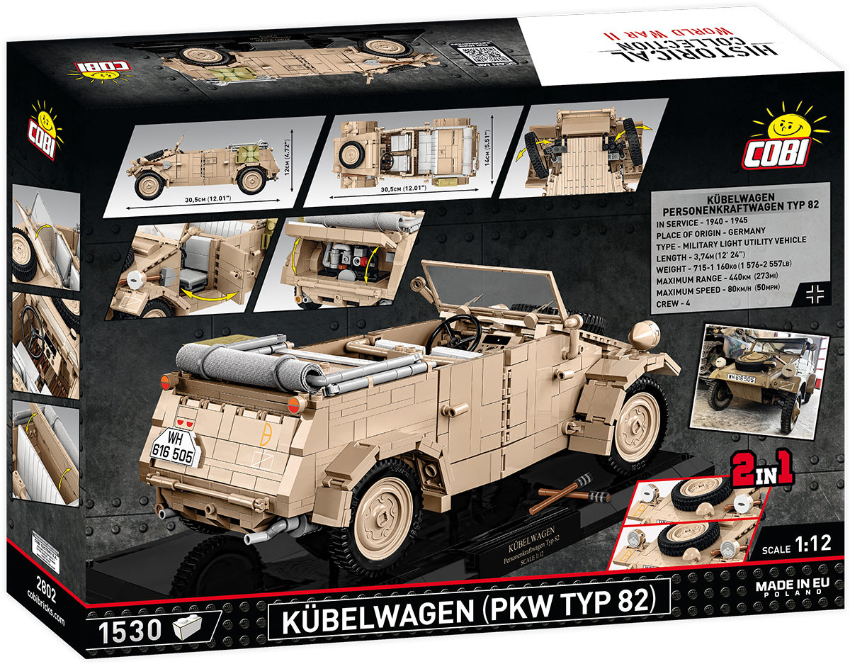 The set (#2802) with 1530 pieces and considerable dimensions is in a class of its own.  Attention is drawn to the carefully reproduced interior, excellent exterior design, completely new elements designed especially for such a large set. The interior of the car is reproduced in detail in every part, including the steering wheel, seats, knobs, switches and the engine compartment containing additional tools! The exterior also raises the bar in terms of accuracy of proportion and detail that only a kit of this size can provide. Suffice it to mention the dedicated windscreen, opening doors, access to the trunk lid and engine compartment, equipment elements and swivel wheels that can be moved with the steering wheel. Our 1:28 scale models are considered to be very detailed. However, it is the 1:12 scale and 1530 elements that allow us to show the capabilities of the COBI building block system. Kübelwagen represents a new level of design, photorealism and impressive size and precision. In this case, the number of blocks matters!