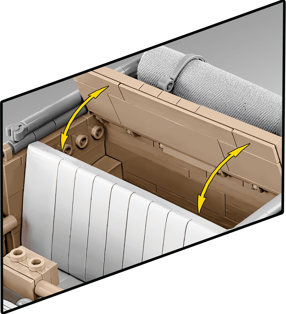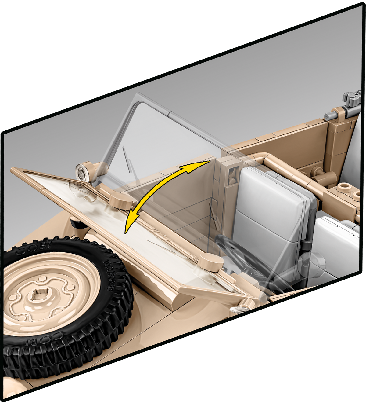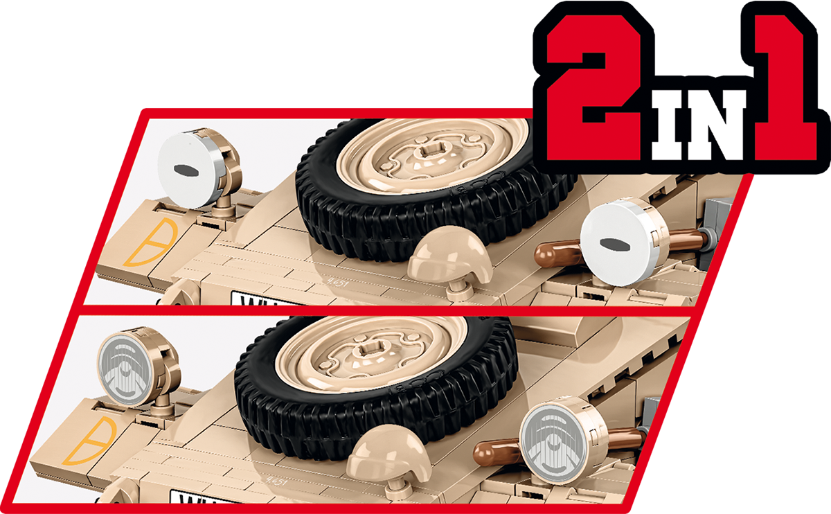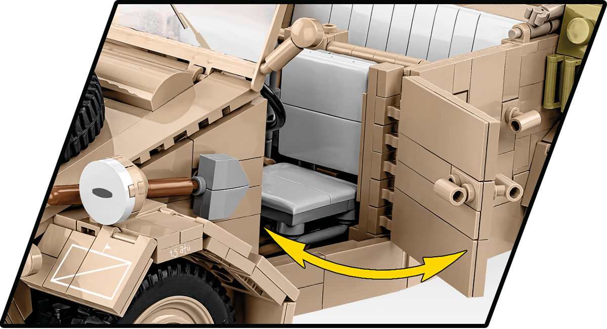 The set (#2802) with 1530 pieces and considerable dimensions is in a class of its own.  Attention is drawn to the carefully reproduced interior, excellent exterior design, completely new elements designed especially for such a large set. The interior of the car is reproduced in detail in every part, including the steering wheel, seats, knobs, switches and the engine compartment containing additional tools! The exterior also raises the bar in terms of accuracy of proportion and detail that only a kit of this size can provide. Suffice it to mention the dedicated windscreen, opening doors, access to the trunk lid and engine compartment, equipment elements and swivel wheels that can be moved with the steering wheel. Our 1:28 scale models are considered to be very detailed. However, it is the 1:12 scale and 1530 elements that allow us to show the capabilities of the COBI building block system. Kübelwagen represents a new level of design, photorealism and impressive size and precision. In this case, the number of blocks matters!