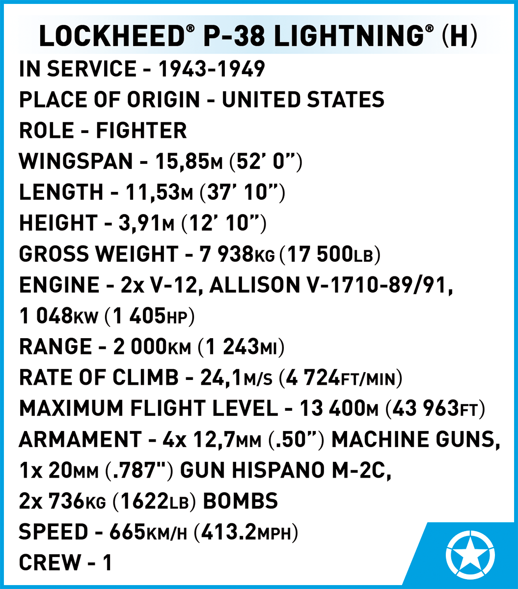 As one of the fastest fighters of World War II (671 km/h), the P-38H was also distinguished by its great maneuverability, speed and versatility, which made it irreplaceable on many fronts - both in Europe and the Pacific.