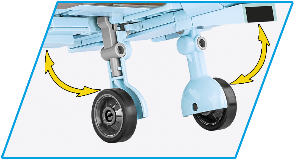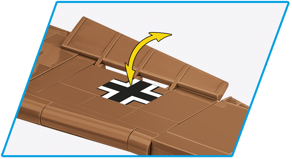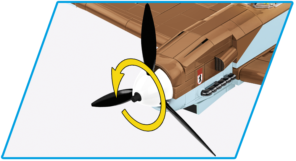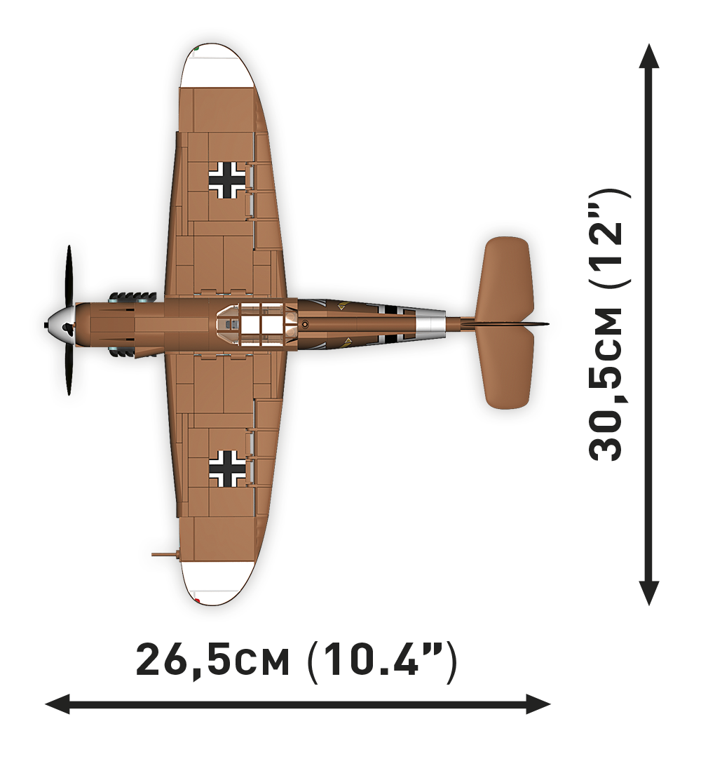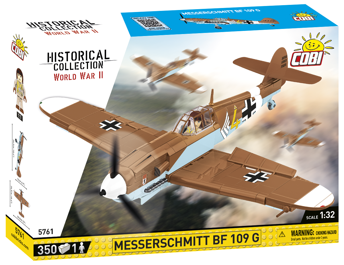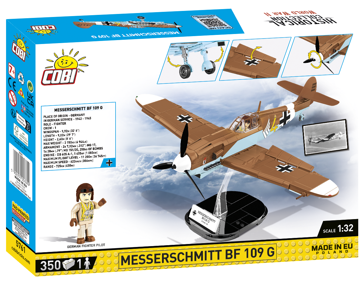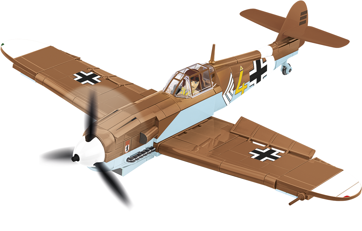 The Messerschmitt BF-109 G is an improved design adapted to the 1:32 scale. The plane is even larger and contains more details reproduced using 350 COBI construction blocks. The plane has a movable propeller and ailerons. Its rotating wheels with rubber tires can be extended from the chassis in the take-off or landing position. The pilot's cabin can be opened to place a pilot figure at the controls! The plane has been covered with high-quality prints that do not rub off even during intense play. This set completely dispenses with stickers. The prints reproduce the tropical painting and equipment of the plane from the war period. The set also includes a special stand that makes the model display more attractive and a plate with the name of the plane.
