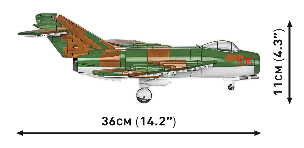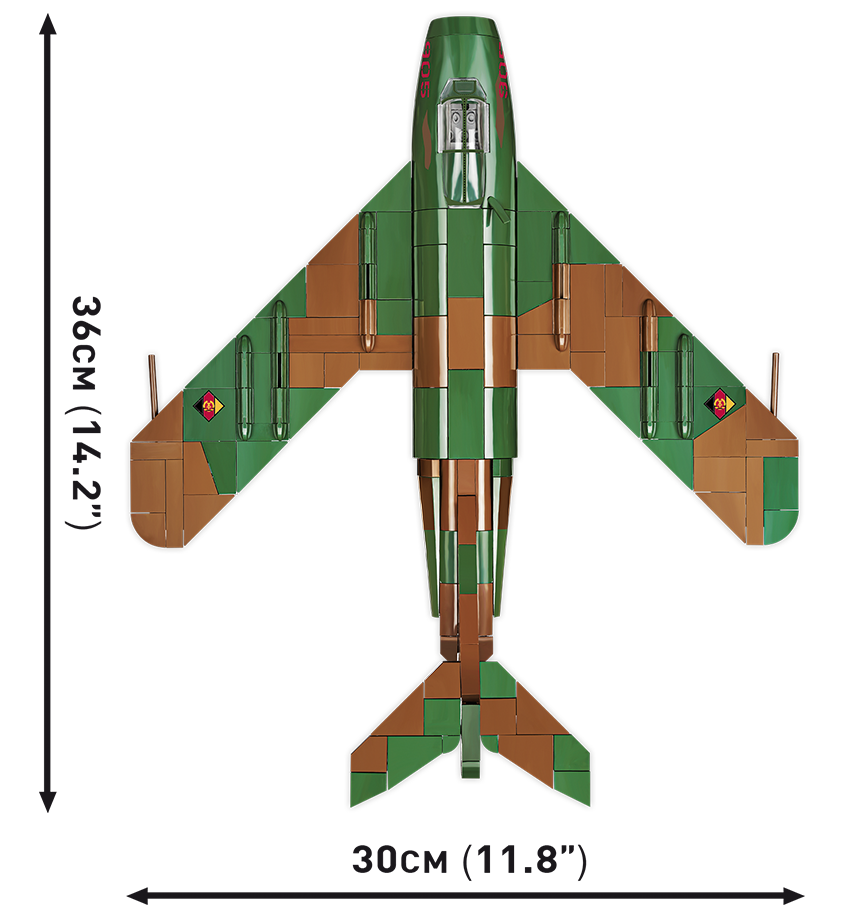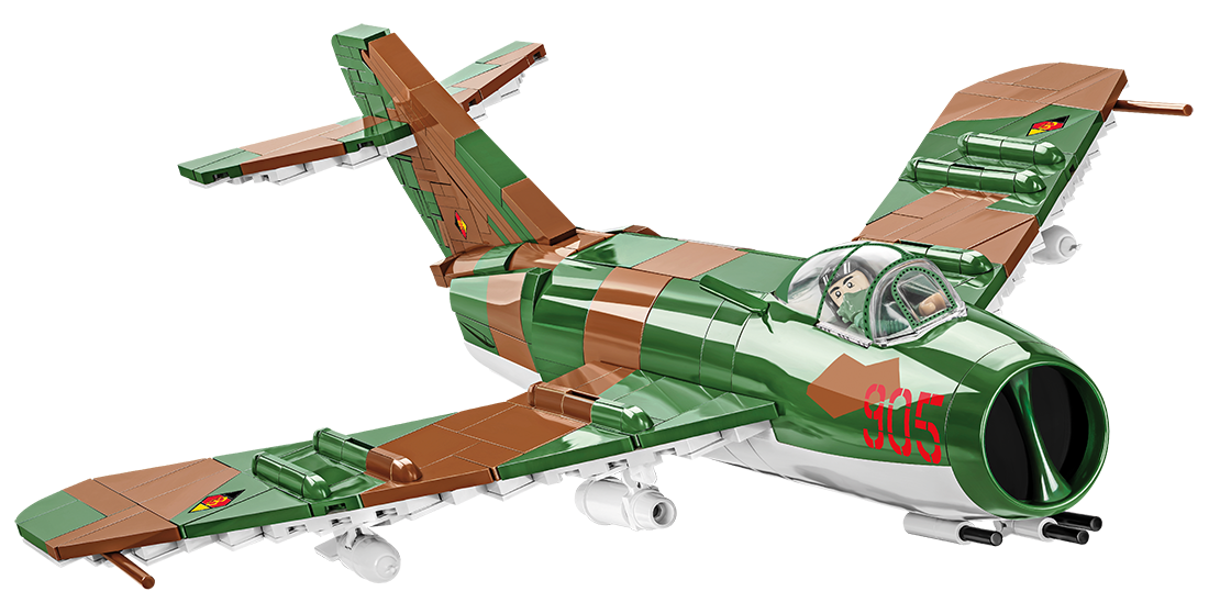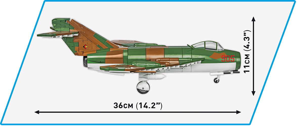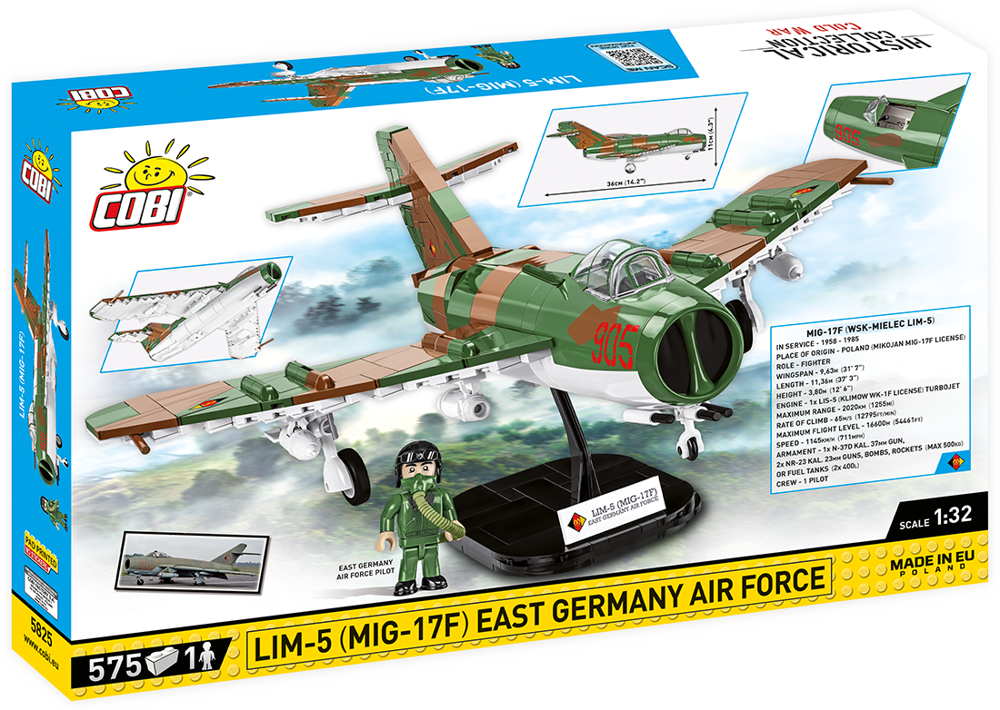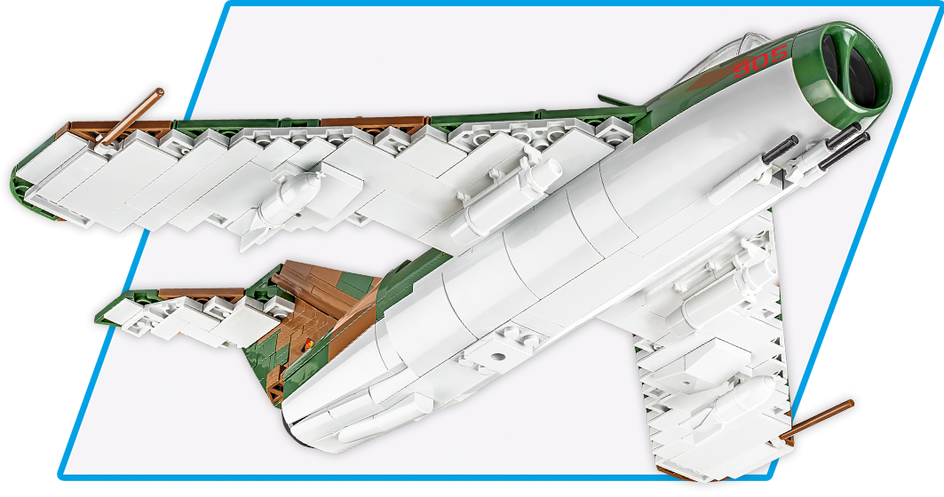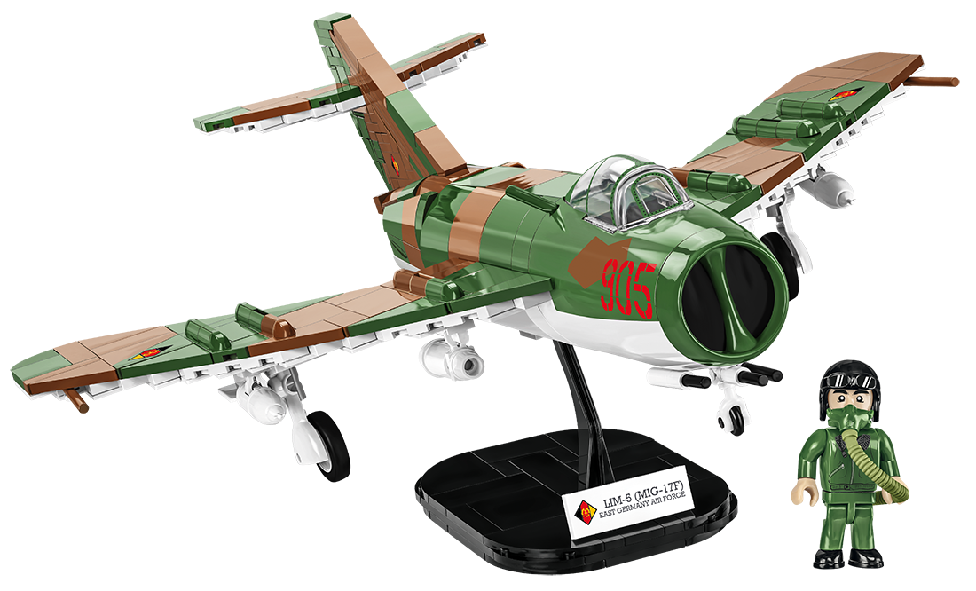 The LIM-5 (MIG-17F) model aircraft was designed in a 1:32 model scale and consists of 575 high-quality elements. All markings, emblems and inscriptions on the model are prints that do not wear off during use. The set has movable elements such as wheels and an opening cabin, in which we can place a sensational figure of a German pilot. The camouflage reproduced from the blocks looks particularly beautiful. The set is accompanied by an exhibition stand containing a plate with the name of the set and the designation of nationality. Thanks to the intuitive instruction based on clear icons, the construction is simple. The aircraft is a must for all fans of aviation, military and military technology. It is also a perfect complement to the Armed Forces, Cold War and Korean War collections. In this series, we also released LIM-1 and LIM-5 aircraft, MIG-15 in the Soviet version and the Czechoslovak S-102 and MIG-17 aircraft.