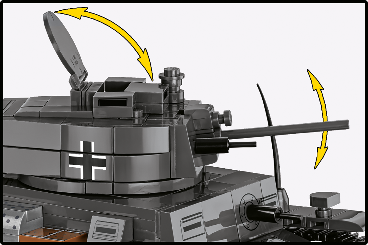 Movable elements - The model has opening hatches and a movable cannon with the ability to raise and lower it, which is a very helpful option when recreating battle scenes. The turret is removable, as is the rear hatch, allowing you to remove the machine's engine and display it next to the model.