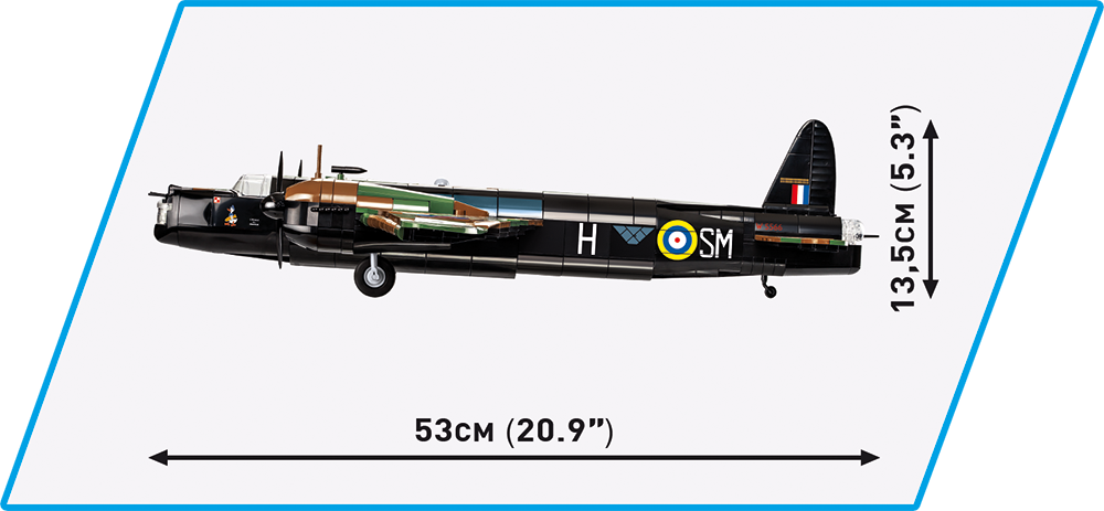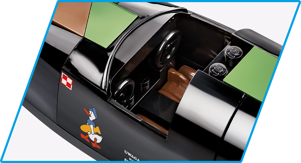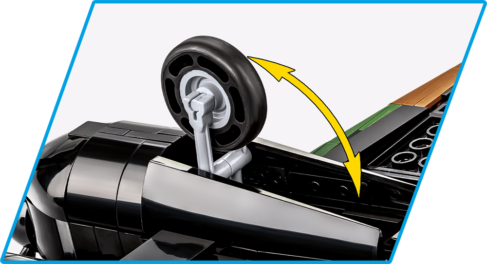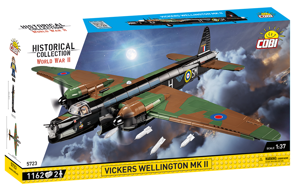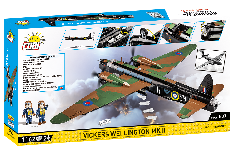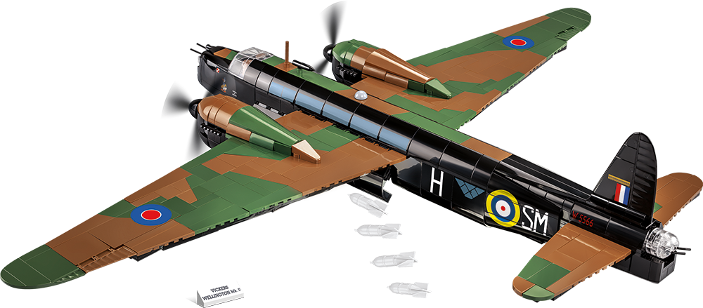 The British Vickers Wellington Bomber was precisely reproduced from COBI construction blocks in a scale of 1:37. The aircraft is 53 cm long and has a wingspan of 71.5 cm. The preparation of such a huge model required the use of as many as 1162 elements. The set includes precise prints that do not wear off during intensive use. History enthusiasts will appreciate the printed historical markings of the 305th Bomb Squadron of the Wielkopolska and Lida Lands named after Marshal Józef Piłsudski. There was even a symbol of the Duck carrying a bomb! The aircraft has rotating propellers, folding wheels and an opening cabin in which you can place the two pilots included in the set. The hatch on the bottom of the plane opens and we can put block bombs there. The whole set is complemented by a plate with the name of the set printed on it.