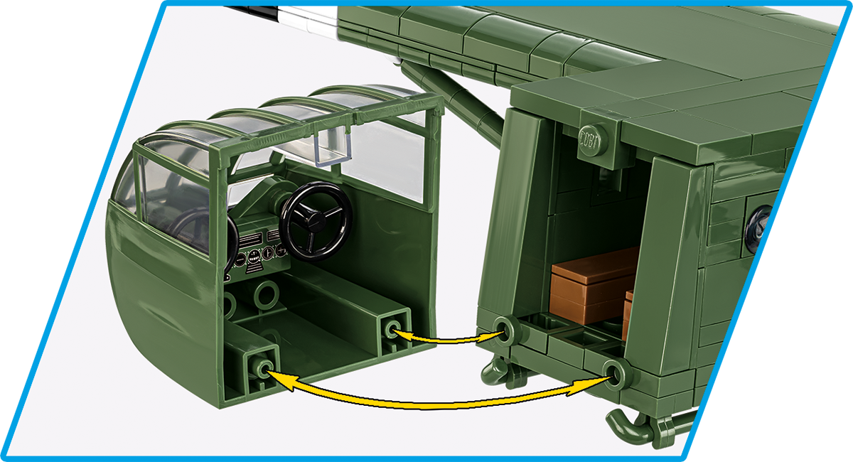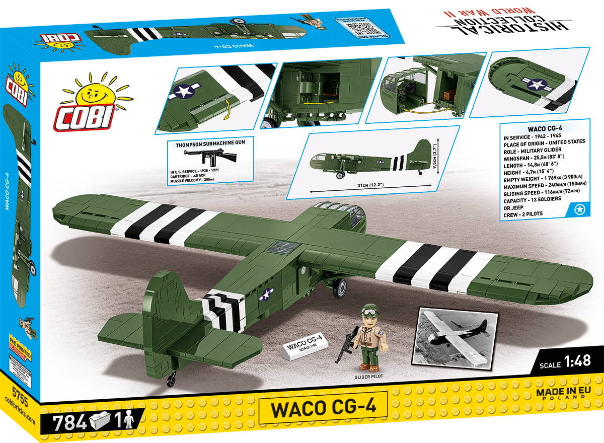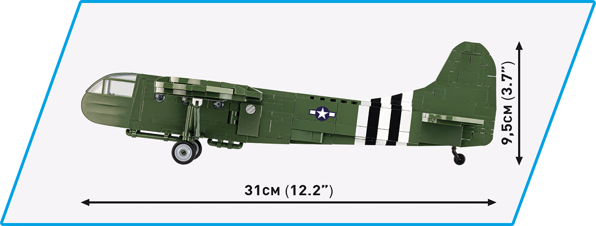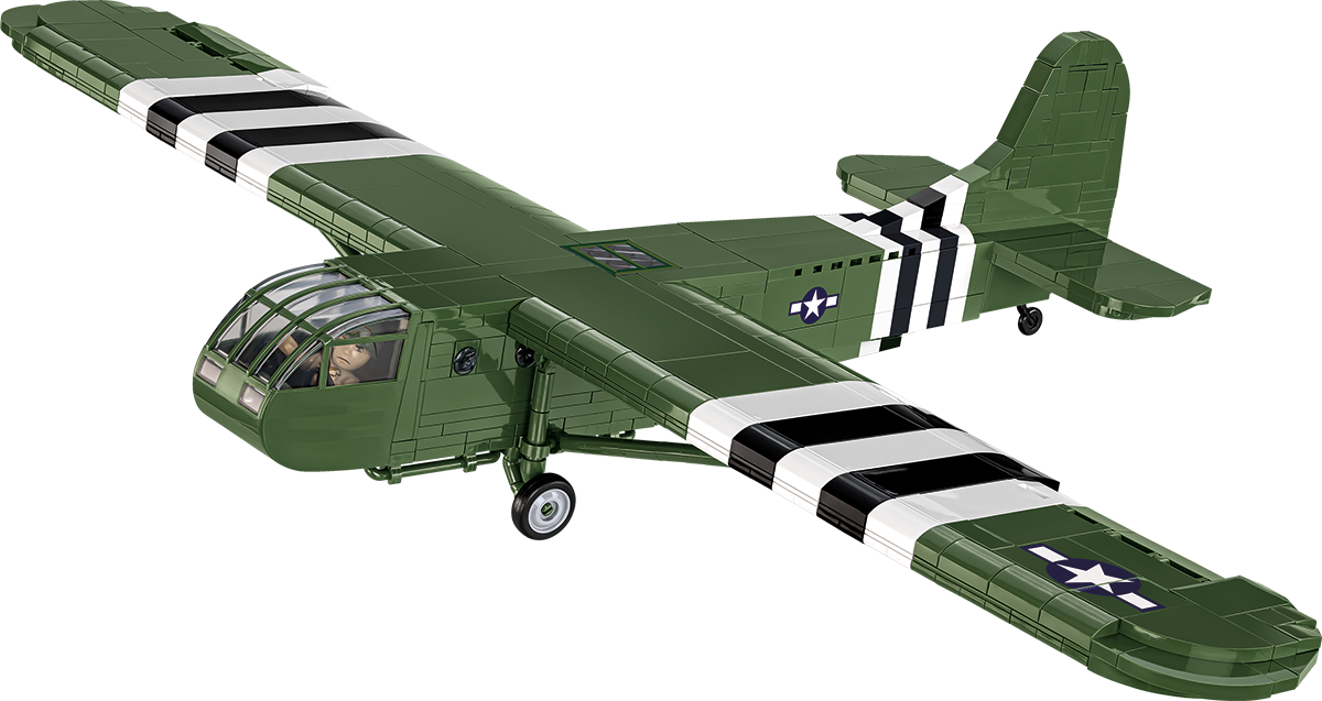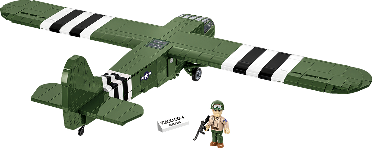 The 1:48 scale block model includes a new block: the glider's nose, which looks exactly like the real one! Inside you can place the figure of the American pilot included in the set. The model features high-quality prints and matches the size of the released set of the Douglas C-47 Skytrain Dakota aircraft. Together, both sets can comprise an extraordinary aerial duo recreating D-Day! Will the Dakota tow the WACO CG-4 in your collection? Build history, piece by piece, with COBI!