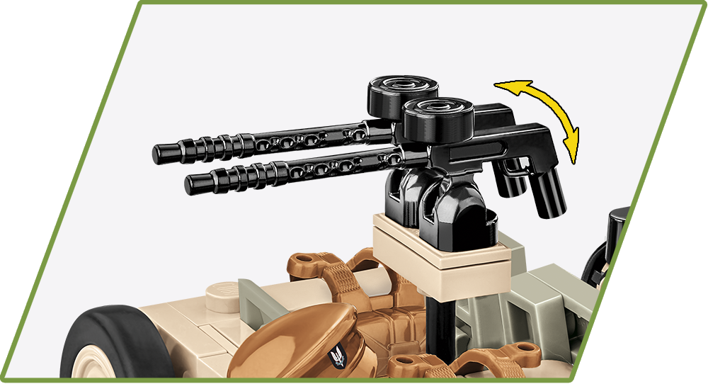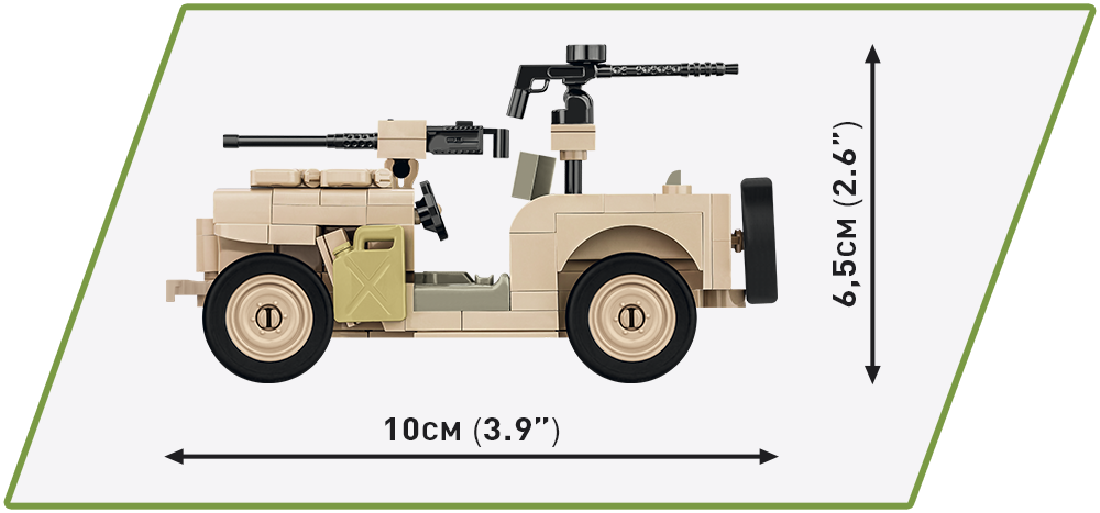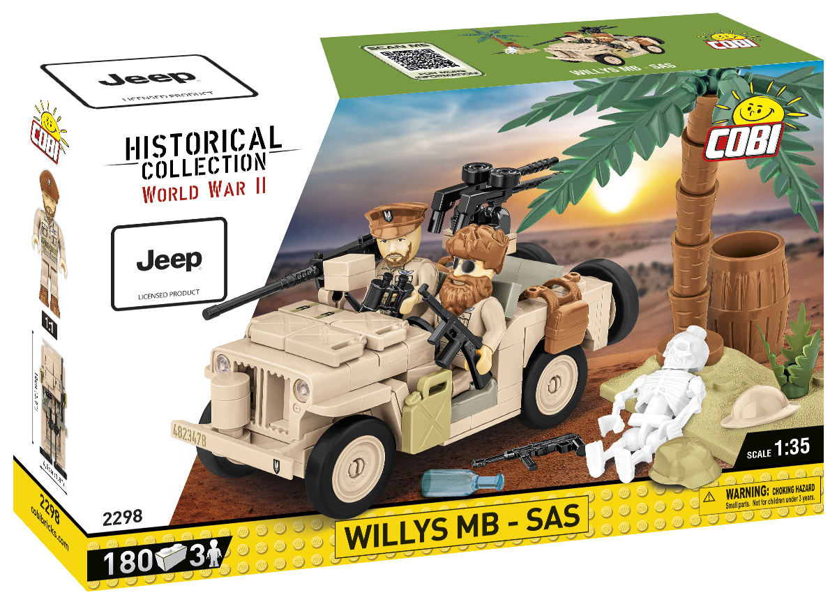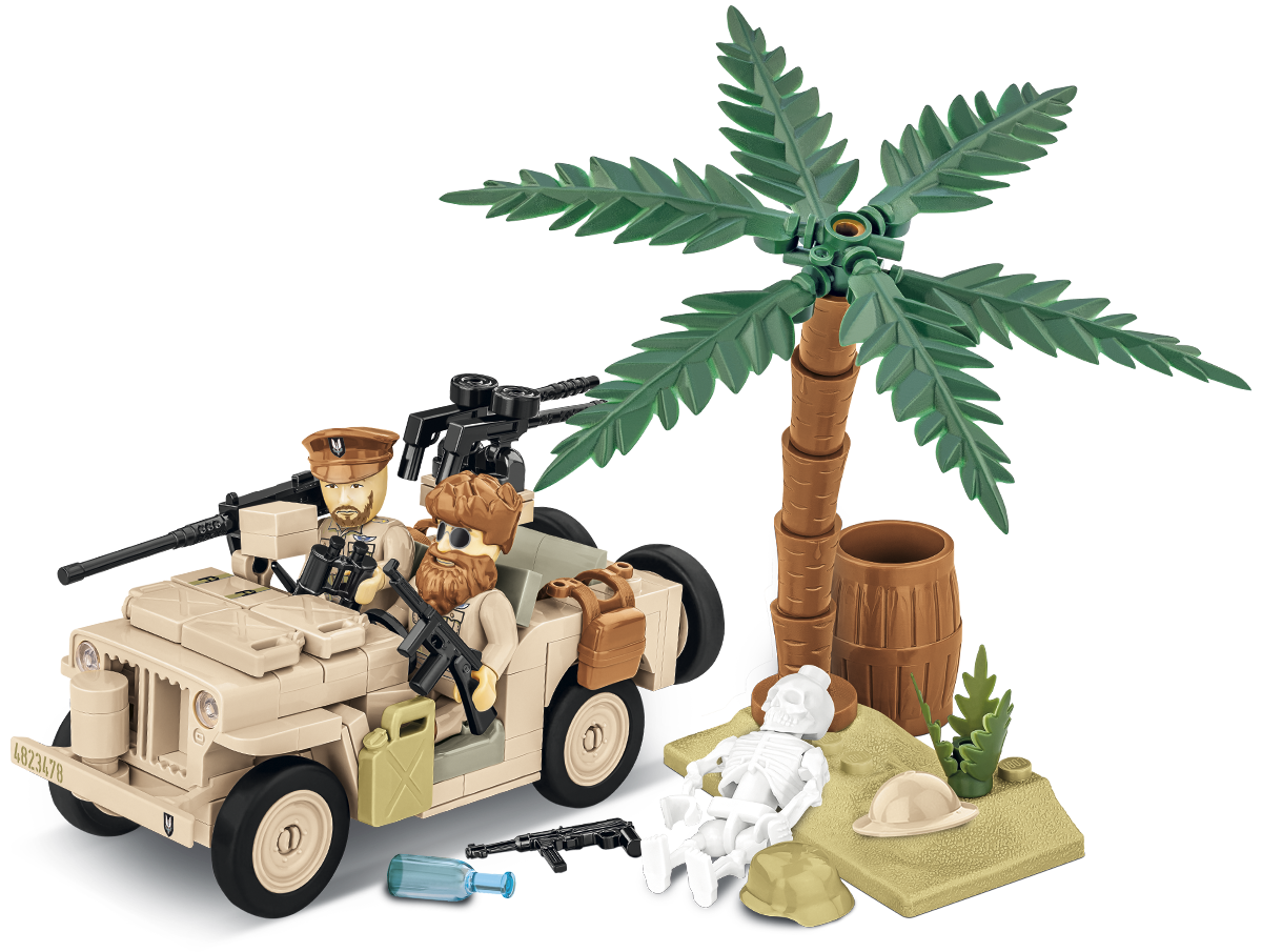 This licensed Willys Jeep was released in the British SAS unit paint scheme. The world's most popular off-road vehicle from the Second World War was designed in 1:35 scale and consists of 180 elements. The presented model differs significantly from those used by the US Army. The extremely characteristic cut-out grill of the vehicle with the condenser is very striking. Such a modification of the stock Jeep allowed it to operate in difficult desert conditions, where it is very easy to overheat! Sand paint and items necessary for survival in the desert placed on the hood and bed distinguish the vehicle and add to its appearance of fighting in Africa. The set includes a skeleton lying under a desert palm tree. Around it there are interesting accessories: helmets, weapons and a bottle.